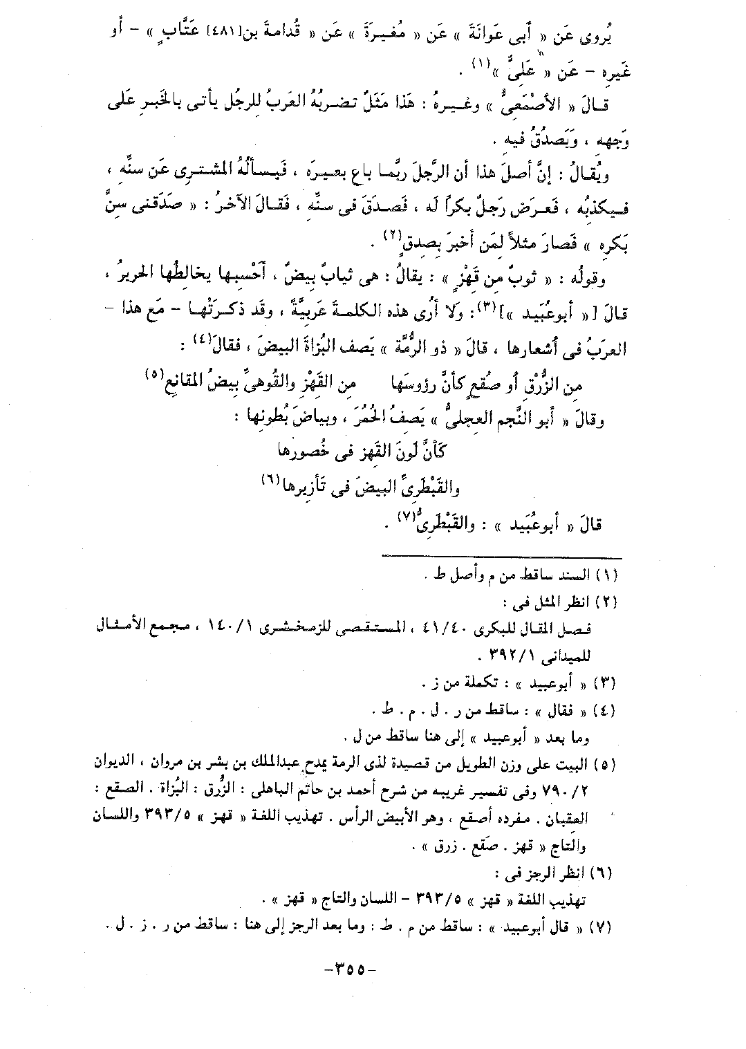 وقوله: "ثوب من قهزٍ": يقال: هي ثياب بيض، أحسبها يخالطها الحرير، قال ["أبو عبيد"]: ولا أرى هذه الكلمة عريبةً، وقد ذكرتها -مع هذا- العرب في أشعارها، قال "ذو الرمة" يصف البزاة البيض، فقال: