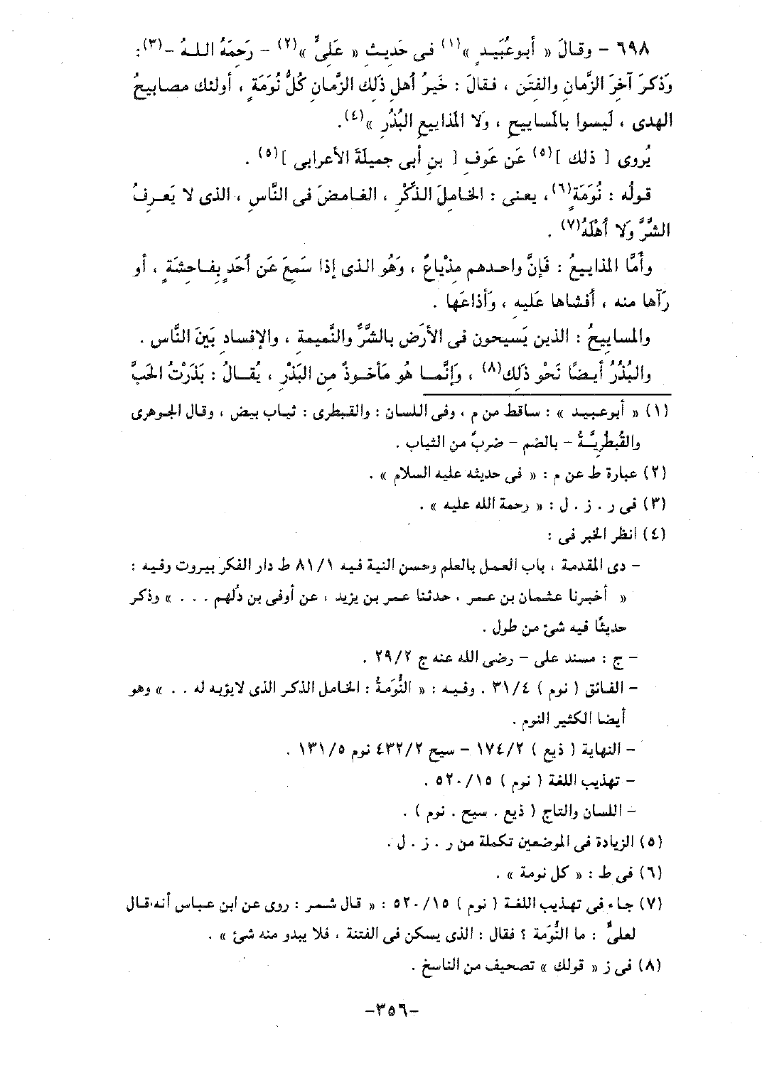 698 - وقال "أبو عبيدٍ" في حديث "علي" -رحمه الله-: وذكر آخر الزمان والفتن، فقال: خير أهل ذلك الزمان كل نومةٍ، أولئك مصابيح الهدى، ليسوا بالمساييح، ولا المذاييع البذر".