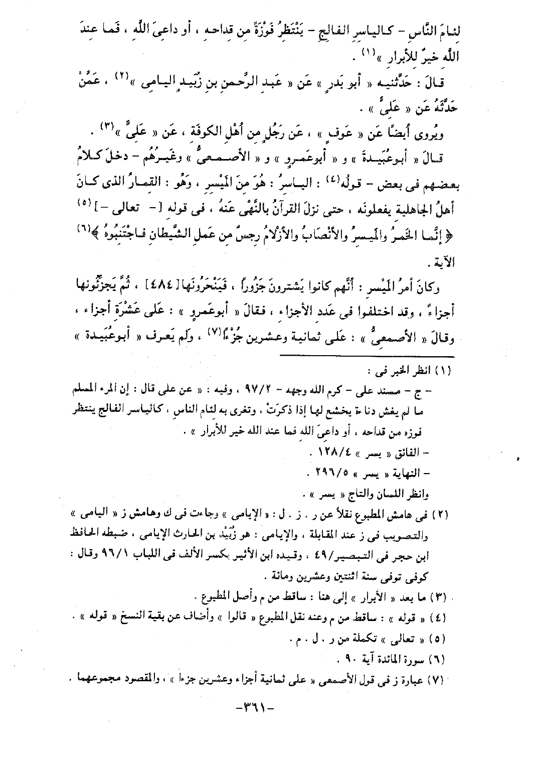 قال "أبو عبيدة" و"أبو عمروٍ" و"الأصمعي" وغيرهم -دخل كلام بعضهم في بعض- قوله: الياسر: هو من الميسر، وهو: القمار الذي كان أهل الجاهلية يفعلونه، حتى نزل القرآن بالنهي عنه، في قوله [تعالى] (إنما الخمر والميسر والأنصاب والأزلام رجس من عمل الشيطان فاجتنبوه) الآية.