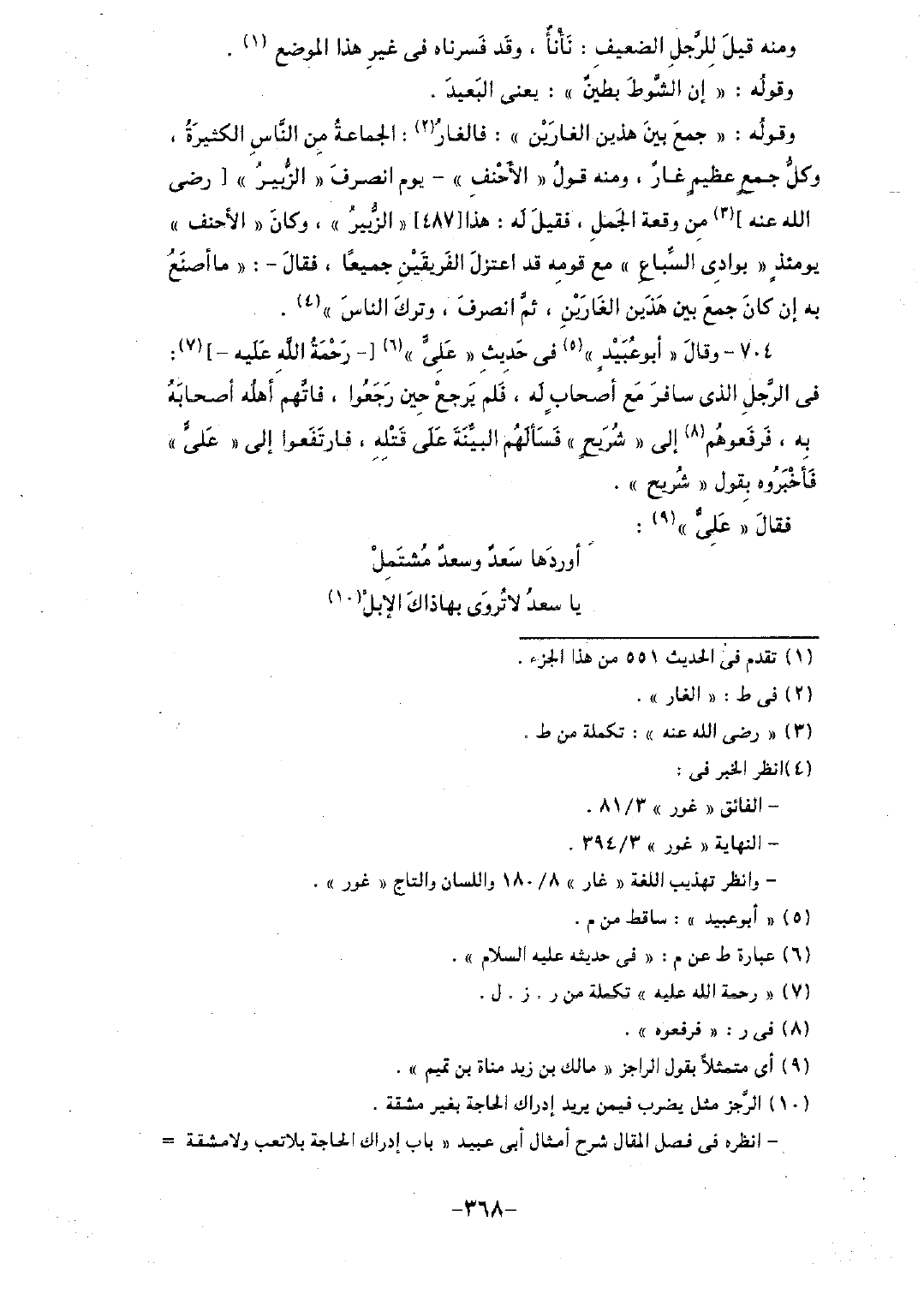 704 - وقال "أبو عبيدٍ" في حديث "علي" [رحمة الله عليه]: في الرجل الذي سافر مع أصحابٍ له، فلم يرجع حين رجعوا، فاتهم أهله أصحابه به، فرفعوهم إلى "شريحٍ" فسألهم البينة على قتله، فارتفعوا إلى "علي" فأخبروه بقول "شريح".