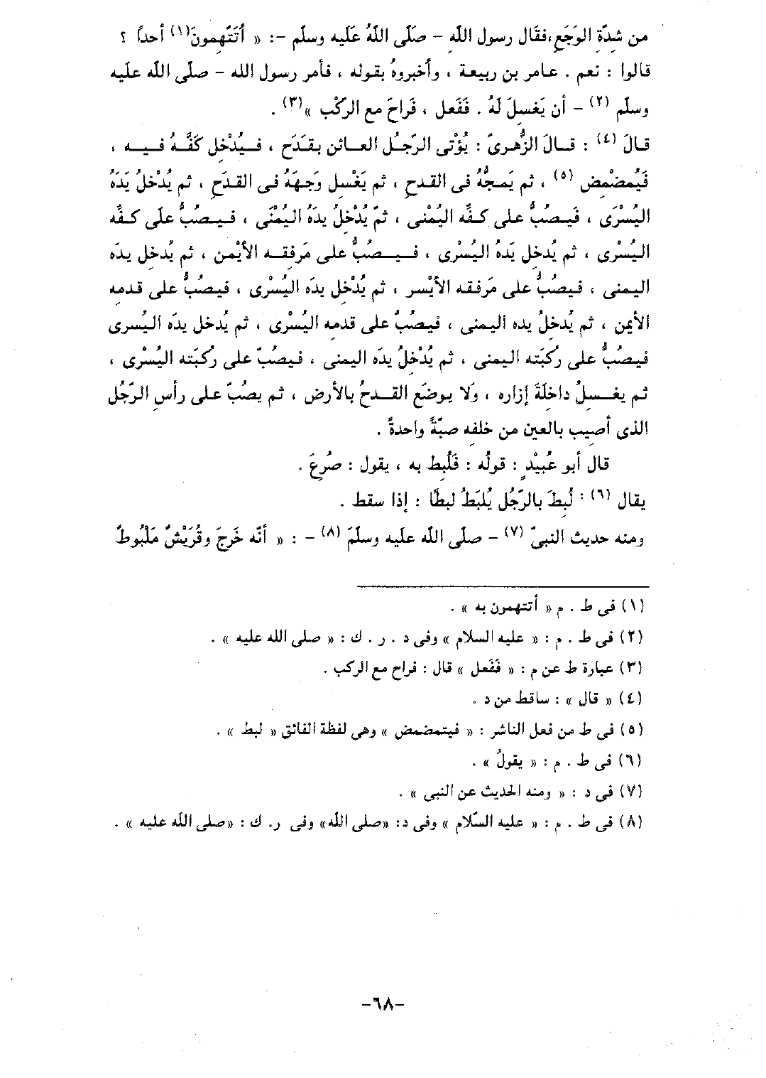 من شدة الوجع، فقال رسول الله - صلى الله عليه وسلم-: "أتتهمون أحداً؟ قالوا: نعم. عامر بن ربيعة، وأخبروه بقوله، فأمر رسول الله - صلى الله عليه وسلم- أن يغسل له. ففعل، فراح مع الركب".