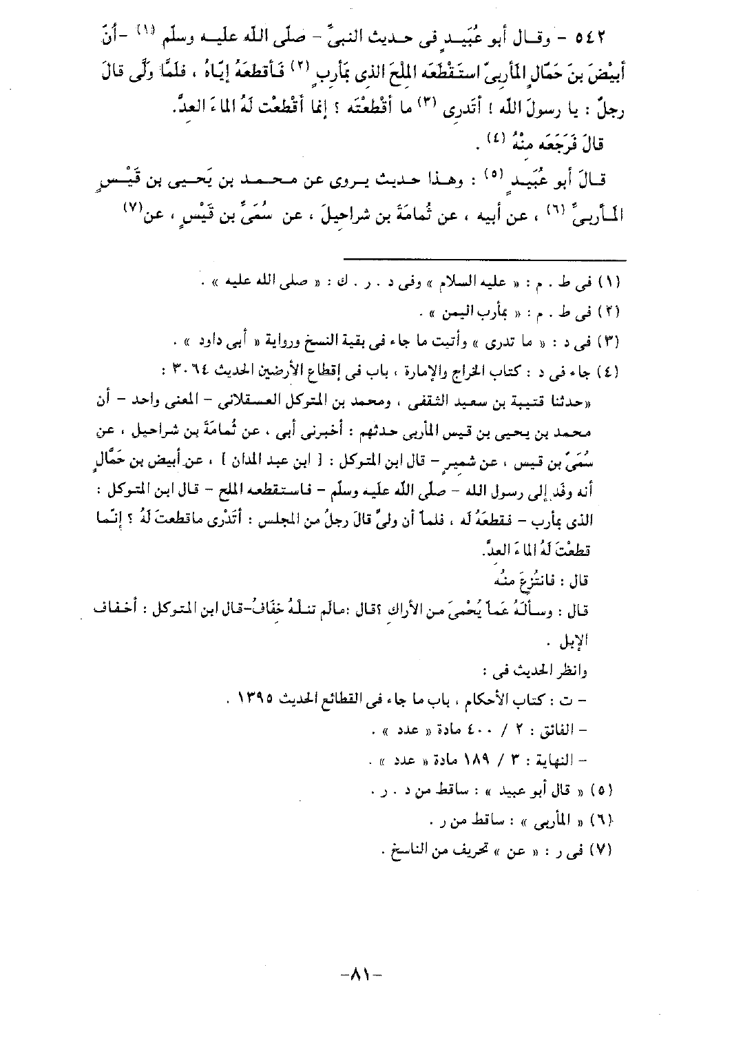 542 - وقال أبو عبيدٍ في حديث النبي - صلى الله عليه وسلم- أن أبيض بن حمالٍ المأربي استقطعه الملح الذي بمأربٍ فأقطعه إياه، فلما ولى قال رجلٌ: يا رسول الله! أتدري ما أقطعته؟ إنما أقطعت له الماء العد.