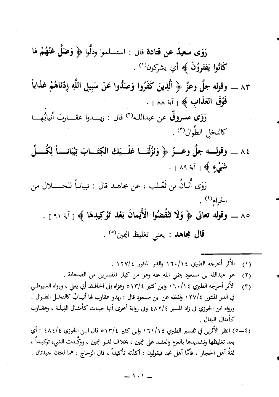 روى سعيد عن قتادة قال استسلموا وذلوا وضل عنهم ما كانوا يفترون أي يشركون 83 - وقوله جل وعز الذين كفروا وصدوا عن سبيل الله زدناهم عذابا فوق العذاب روى مسروق عن عبد الله قال زيدوا عقارب أنيابها كالنخل الطوال 84 - وقوله جل وعز ونزلنا عليك الكتاب تبيانا لكل شئ روى أبان بن ثعلب عن مجاهد قال تبيانا للحلال من الحرام 85 - وقوله تعالى ولا تنقضوا الأيمان بعد توكيدها قال مجاهد يعني تغليظ اليمين