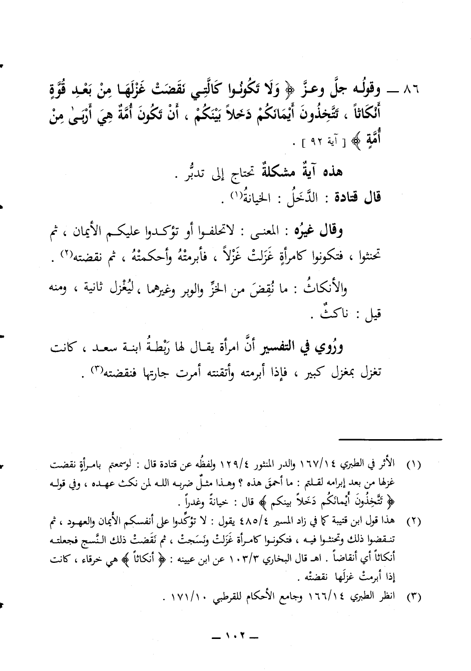 86 - وقوله جل وعز ولا تكونوا كالتي نقضت غزلها من بعد قوة أنكاثا تتخذون أيمانكم دخلا بينكم أن تكون أمة هي أربى من أمة