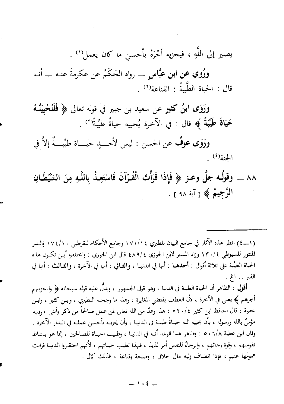 يصير الى الله فيجزية فإن أجره بأحسن ما كان يعمل وروى عن ابن عباس رواه الحكم عن عكرمة عنه أنه قال الحياة الطيبة القناعة وروى ابن كثير عن سعيد بن جبير في قوله تعالى فلنحيينه حياة طيبة قال في الآخرة يحييه حياه طيبة وروى عوف عن الحسن ليس لأحد حياة طيبة إلا في الجنة 88 - وقوله جل وعز فإذا قرأت القرآن فاستعذ بالله من الشيطان الرجيم
