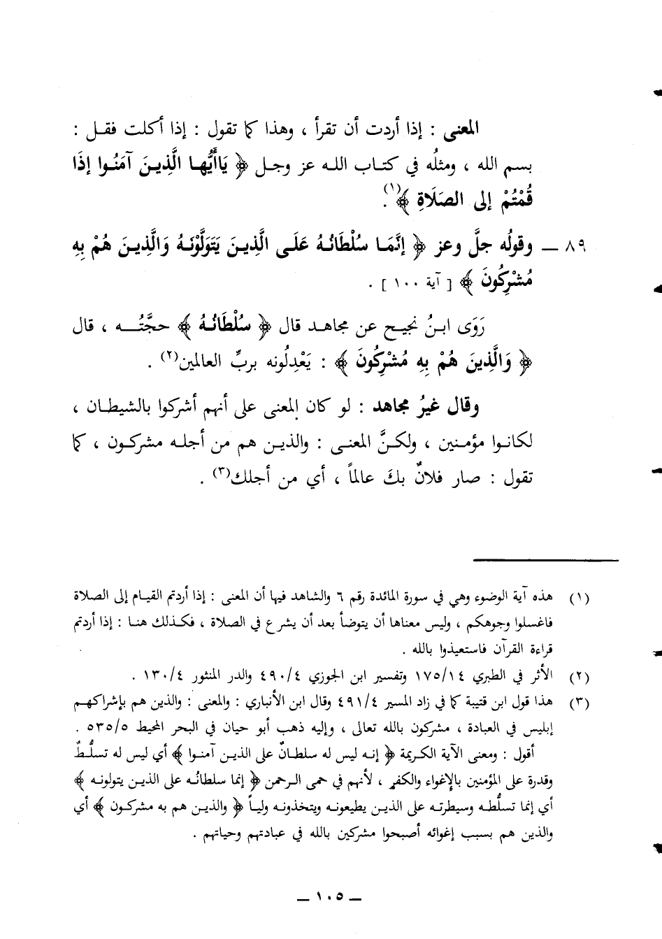 المعنى إذا أردت أن تقرأ وهذا كما تقول إذا أكلت فقل بسم الله ومثله في كتاب الله عز وجل يا أيها الذين آمنوا إذا قمتم الى الصلاة 89 - وقوله جل وعز إنما سلطانه على الذين يتولونه والذين هم به مشركون روى ابن نجيح عن مجاهد قال سلطانه حجته قال والذين هم به مشركون يعدلونه برب العالمين وقال غير مجاهد لو كان المعنى على أنهم أشركوا بالشيطان لكانوا مؤمنين ولكن المعنى والذين والذين هم من أجله مشركون كما تقول صار فلان بك عالما أي من أجلك
