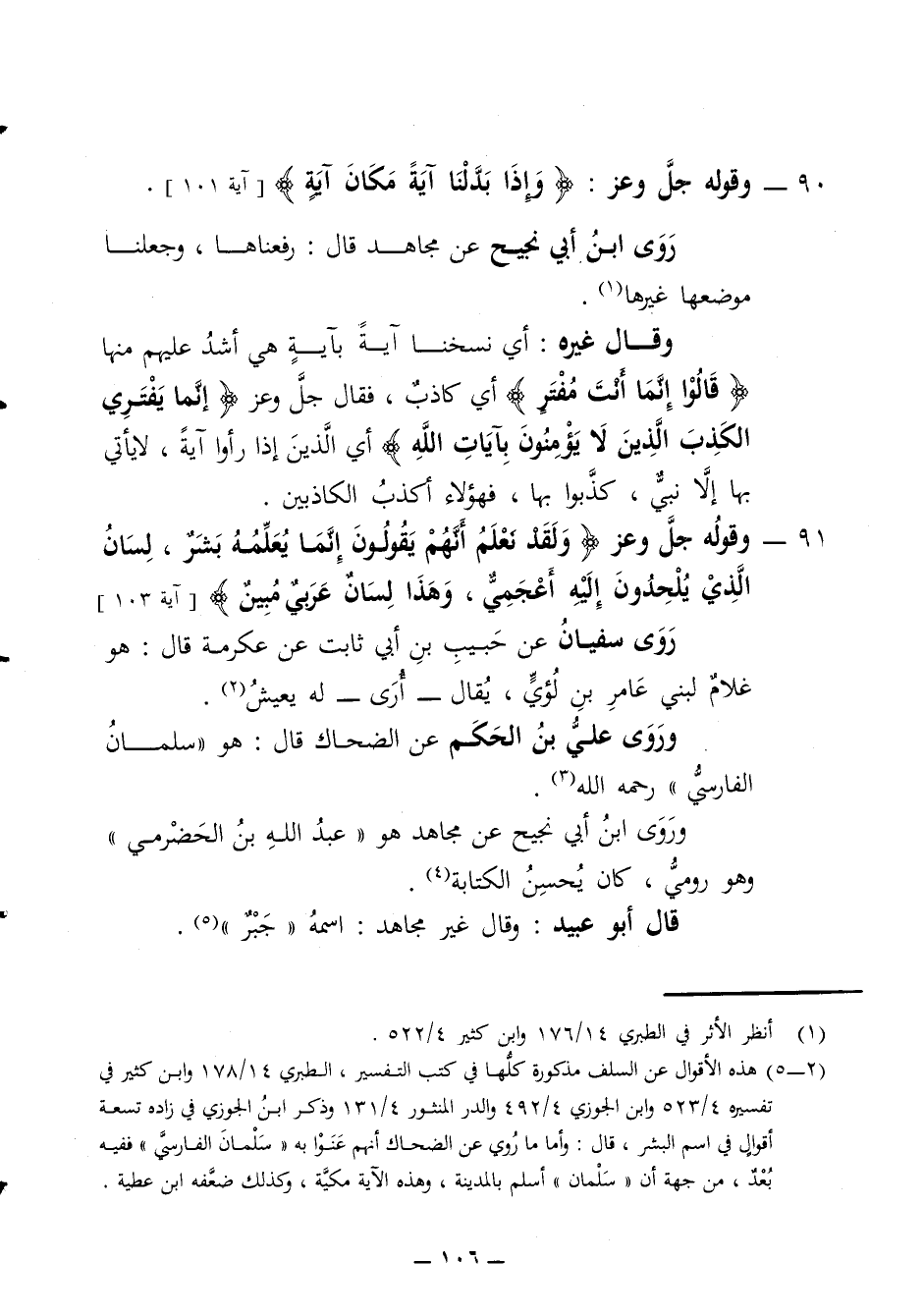 روى ابن أبي نجيح عن مجاهد قال رفعناها وجعلنا موضعها غيرها وقال غيره أي نسخنا آية بأية هي أشد عليهم منها قالوا إنما أنت مفتر أي كاذب فقال جل وعز إنما يفتري الكذب الذين لا يؤمنون بآيات الله أي الذي إذا رأوا آية لا يأتي بها إلا نبي كذبوا بها فهؤلاء أكذب الكاذبين 91 - وقوله جل وعز ولقد نعلم أنهم يقولون إنما يعلمه بشر لسان الذي يحلدون إليه أعجمي وهذا لسان عربي مبين روى سفيان عن حبيب بن أبي ثابت عن عكرمة قال هو غلام لبني عامر بن لؤي يقال أرى له يعيش وروى علي بن الحكم عن الضحاك قال هو سلمان الفارسي رحمه الله وروى ابن أبي نجيح عن مجاهد هو عبد الله بن الحضرمي وهو رومي كان يحسن الكتابة قال أبو عبيد وقال غير مجاهد أسمه جبر