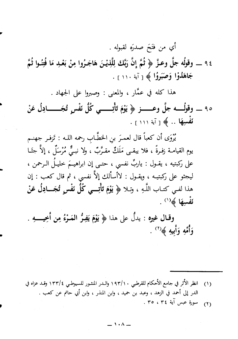 أي من فتح صدره لقبوله 94 - وقوله جل وعز ثم إن ربك للذين هاجروا من بعد ما فتنوا ثم جاهدوا وصبروا هذا كله في عمار والمعنى وصبروا على الجهاد 95 - وقوله جل وعز يوم تأتي كل نفس تجادل عن نفسها يروى أن كعبا قال لعمر بن الخطاب رحمه الله تزفر جهنم يوم القيامة زفرة فلا يبقى ملك مقرب ولا نبي مرسل إلا جثا على ركبتيه يقول يا رب نفسي حتى إن إبراهيم خليل الرحمن ليجثو على ركبتيه ويقول لا أسألك إلا نفسي ثم قال كعب إن هذا لفي كتاب الله وتلا يوم تأتي كل نفس تجادل عن نفسها وقال غيره يدل على هذا يوم يفر المرء من أخيه وأمه وأبيه