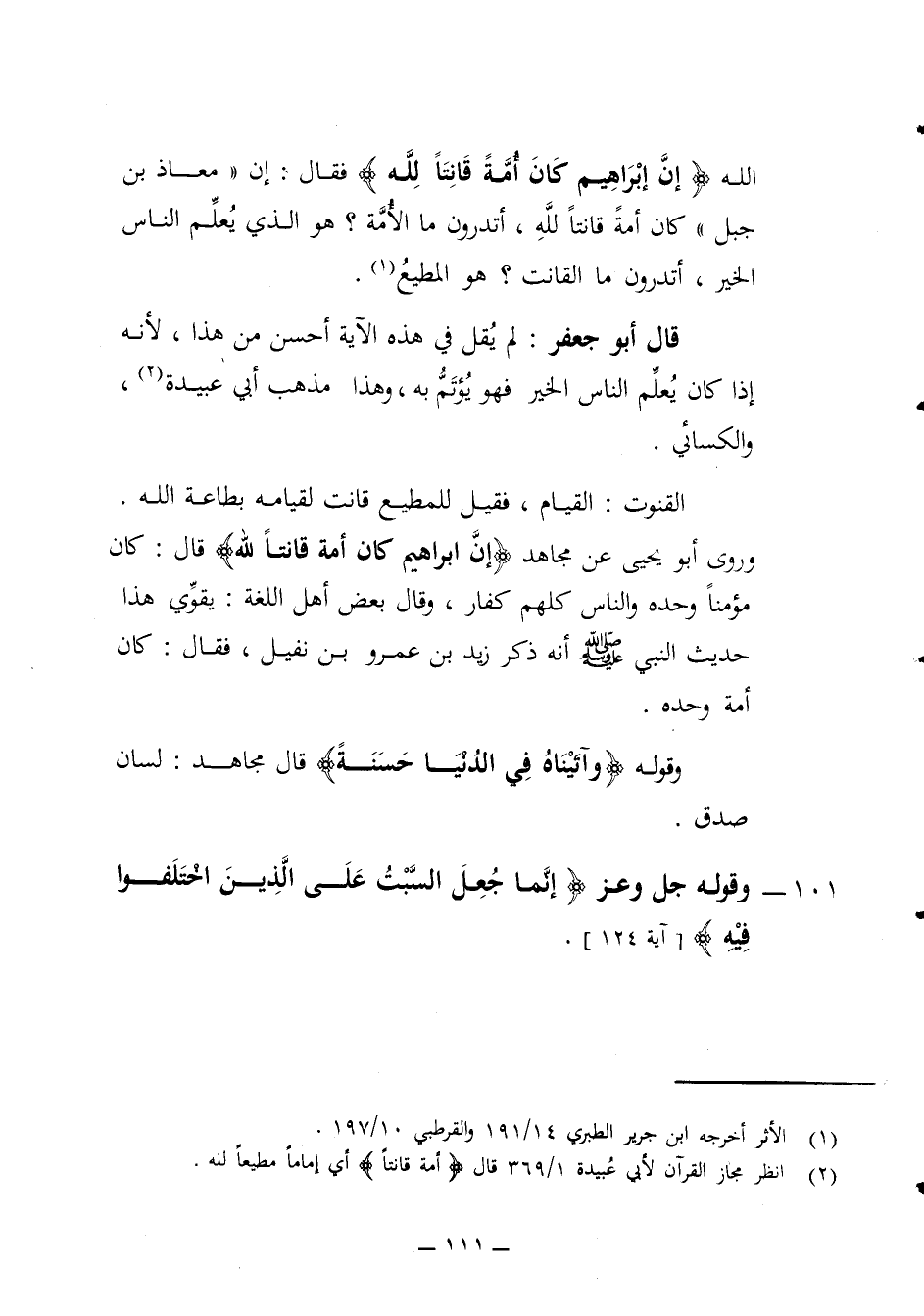 الخير أتدرون ما القانت هو المطيع قال أبو جعفر لم يقل في هذه الآية أحسن من هذا لأنه إذا كان يعلم الناس الخير فهو يؤتم به وهذا مذهب أبي عبيدة والكسائي القنوت القيام فقيل للمطيع قانت لقيامه بطاعة الله وروى أبو يحيى عن مجاهد إن إبراهيم كان أمة قانتا لله قال كان مؤمنا وحده والناس كلهم كفار وقال بعض أهل اللغة يقوي هذا حديث النبي (صلع) أنه ذكر زيد بن عمرو بن نفيل فقال كان أمة وحده وقوله وآتيناه في الدنيا حسنة قال مجاهد لسان صدق 101 - وقوله جل وعز إنما جعل السبت على الذين اختلفوا فيه