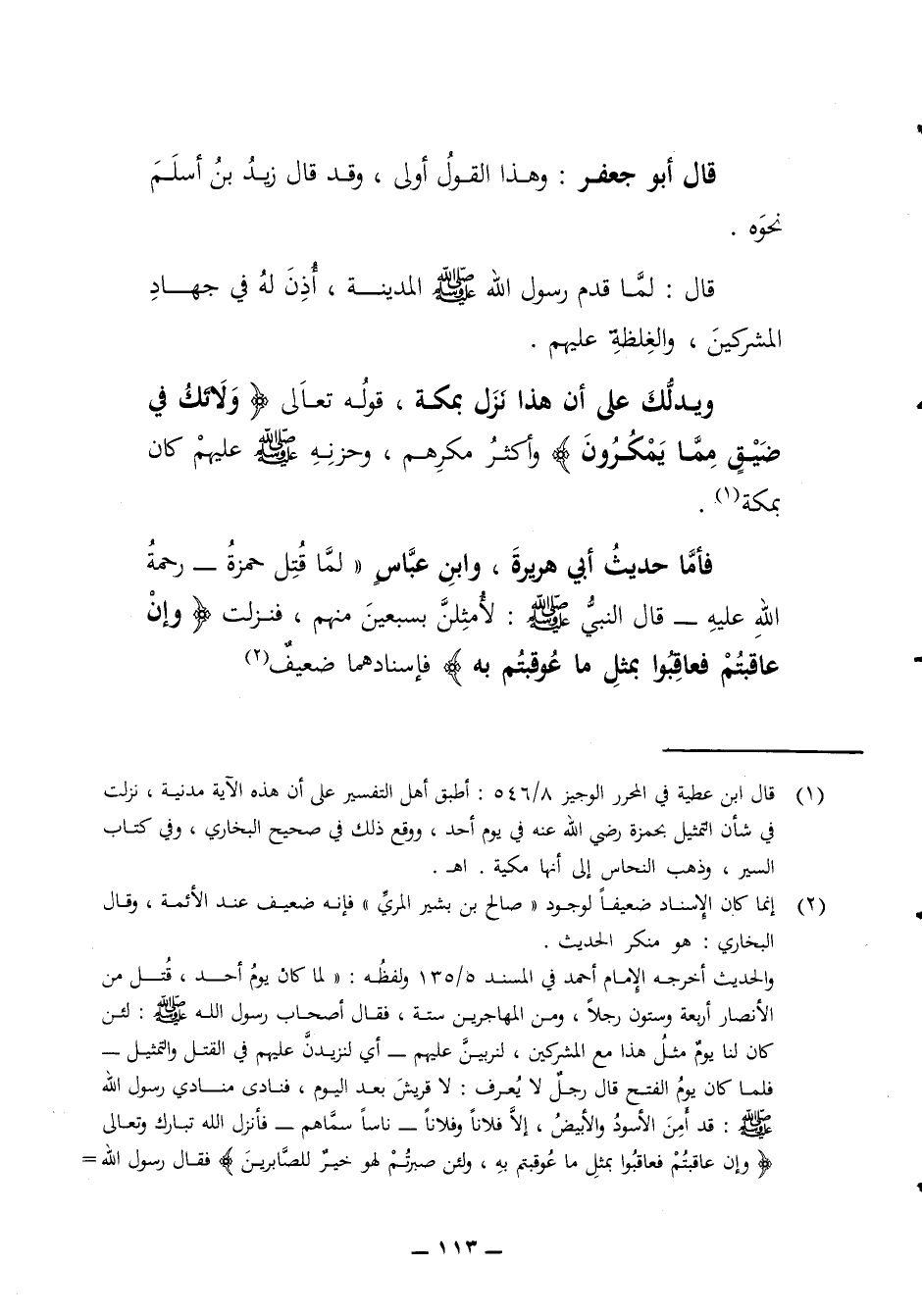 قال أبو جعفر وهذا القول أولى وقد قال زيد بن أسلم نحوه قال لما قدم رسول الله (صلع) المدينة أذن له في جهاد المشركين والغلظة عليهم ويدلك على أن هذا نزل بمكة قوله تعالى ولاتك في ضيق مما يمكرون وأكثر مكرهم وحزنه (ص) عليهم كان بمكة فأما حديث أبي هريرة وابن عباس لما قتل حمزه رحمة الله عليه قال النبي (ص) لأمثلن بسبعين منهم فنزلت وإن عاقبتم فعاقبوا بمثل ما عوقبتم به فإسنادهما ضعيف