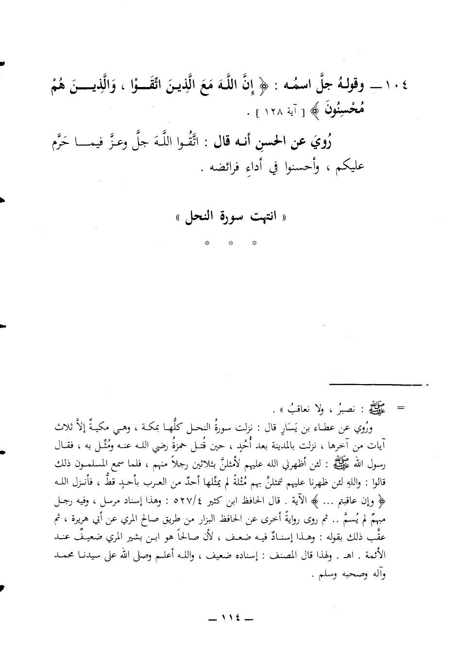 104 - وقوله جل أسمه إن الله مع الذين أتقوا والذين هم محسنون روى عن الحسن أنه قال اتقوا الله جل وعز فيما حرم عليكم وأحسنوا في أداء فرائضه أنتهت سورة النحل