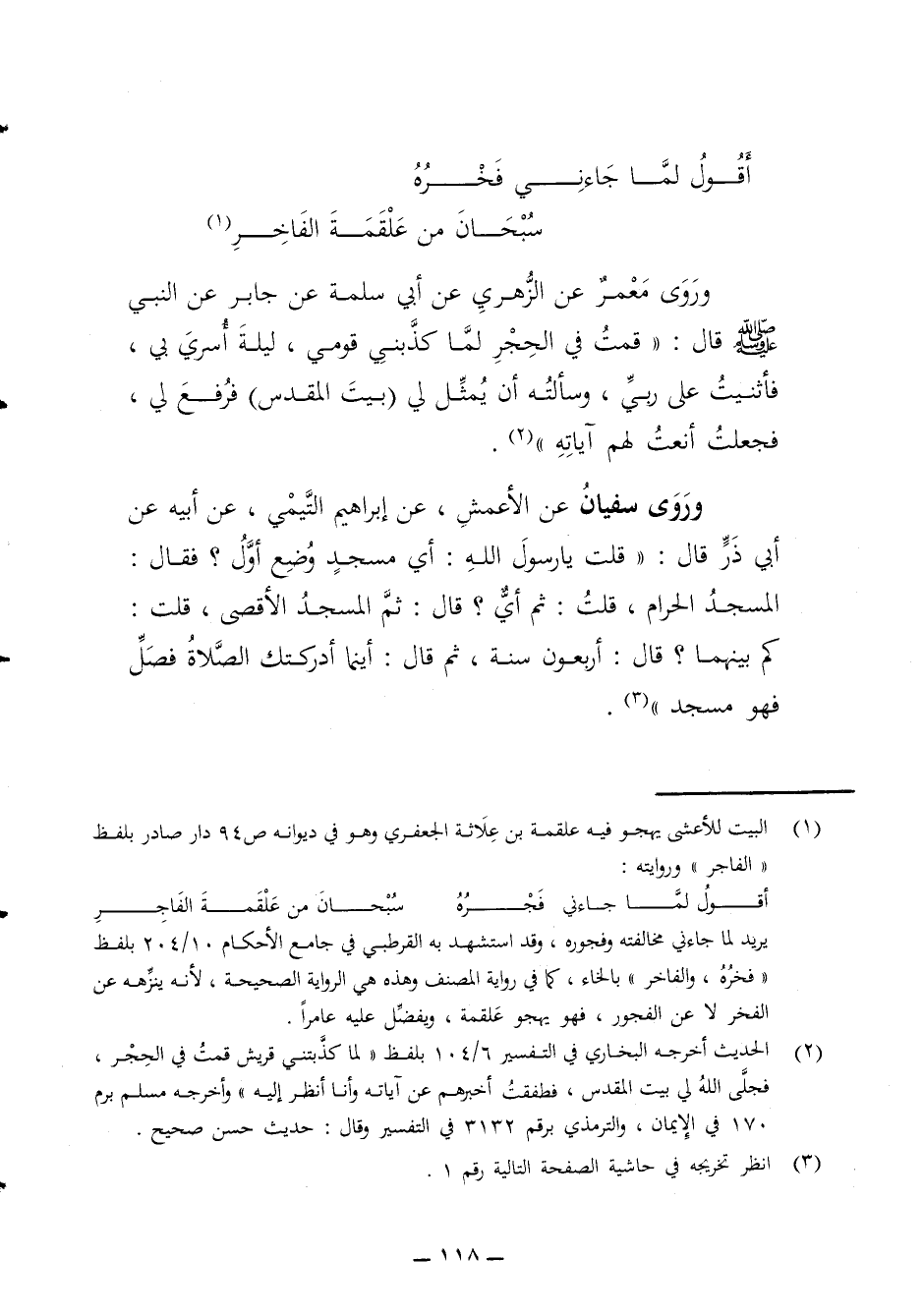 * أقول لما جائني فخره * سبحان من علقمة الفاخر * وروى معمر عن الزهري عن أبي سلمة عن جابر عن النبي (ص) قال قمت في الحجر لما كذبني قومي ليلة أسري بي فأثنيت على ربي وسألته أن يمثل لي بيت المقدس فرفع لي فجعلت أنعت لهم آياته وروى سفيان عن الأعمش عن إبراهيم التيمي عن أبيه عن أبي ذر قال قلت يا رسول الله أي مسجد وضع أول فقال المسجد الحرام قلت ثم أي قال ثم المسجد الأقصى قلت كم بينهما قال أربعون سنة ثم قال أينما أدركتك الصلاة فصل فهو مسجد
