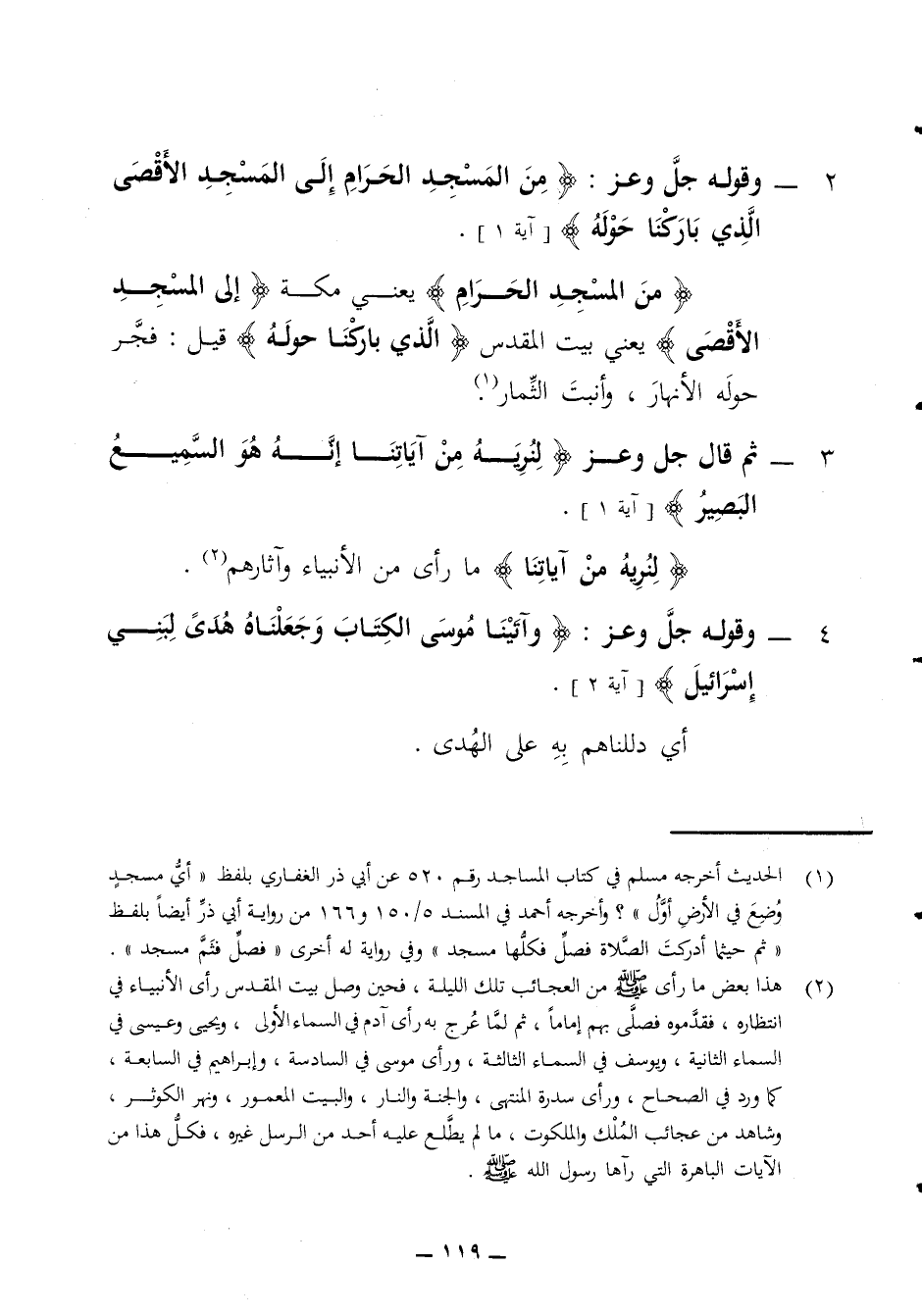 2 - وقوله جل وعز من المسجد الحرام الى المسجد الأقصى الذي باركنا حوله من المسجد الحرام يعني مكة الى المسجد الأقصى يعني بيت المقدس الذي باركنا حوله قيل فجر حوله الأنهار وأنبت الثمار 3 - ثم قال جل وعز لنريه من آياتنا إنه هو السميع البصير لنريه من آياتنا ما رأى من الأنبياء وآثارهم 4 - وقوله جل وعز وآتينا موسى الكتاب وجعلناه هدى لبني إسرائيل أي دللناهم به على الهدى