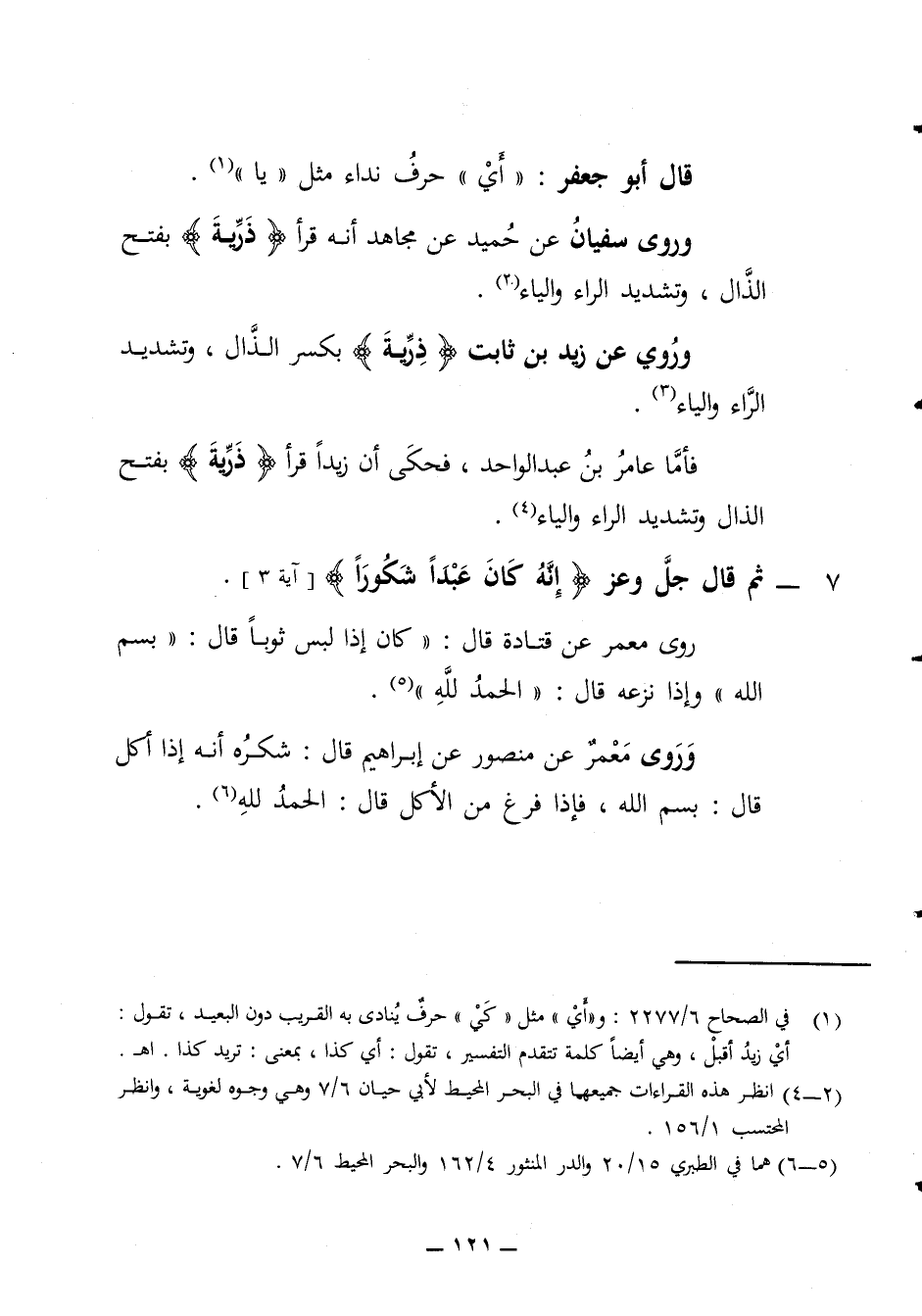 قال أبو جعفر أي حرف نداء مثل يا وروى سفيان عن حميد عن مجاهد أنه قرأ ذرية بفتح الذال وتشديد الراء والياء وروى عن زيد بن ثابت ذرية بكسر الذال وتشديد الراء والياء فأما عامر بن عبد الواحد فحكي أن زيدا قرأ ذرية بفتح الذال وتشديد الراء والياء 7 - ثم قال جل وعز إنه كان عبدا شكورا روى معمر عن قتادة قال كان إذا لبس ثوبا قال بسم الله وإذا نزعه قال الحمد لله وروى معمر عن منصور عن إبراهيم قال شكره أنه إذا أكل قال بسم الله فإذا فرغ من الأكل قال الحمد لله