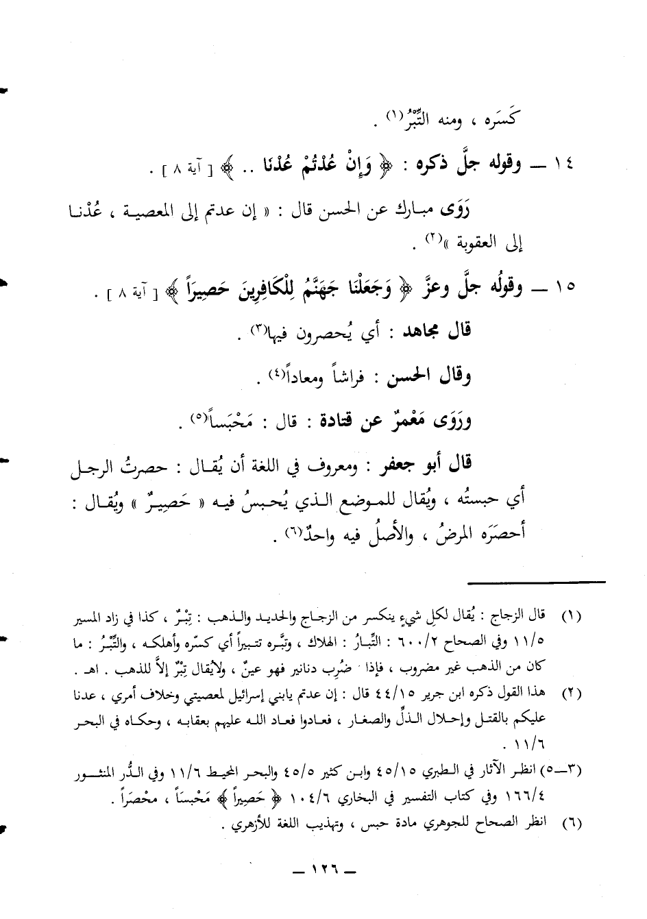 كسرة ومنه التبر 14 - وقوله جل ذكره وإن عدتم عدنا روى مبارك عن الحسن قال إن عدتم الى المعصية عدنا الى العقوبة 15 - وقوله جل وعز وجعلنا جهنم للكافرين حصيرا قال مجاهد أي يحصرون فيها وقال الحسن فراشا ومعادا