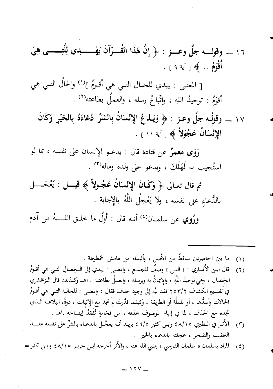 16 - وقوله جل وعز إن هذا القرآن يهدي للتي هي أقوم المعنى يهدي للحال التي هي أقوم والحال التي هي أقوم توحيد الله واتباع رسله والعمل بطاعته 17 - وقوله جل وعز ويدع الإنسان بالشر دعاءه بالخير وكان الإنسان عجولا روى معمر عن قتادة قال يدعو الإنسان على نفسه بما لو استجيب له لهلك ويدعو على ولده وماله ثم قال تعالى وكان الإنسان عجولا قيل يعجل بالدعاء على نفسه ولا يعجل الله بالإجابة وروى عن سلمان انه قال أول ما خلق الله من آدم