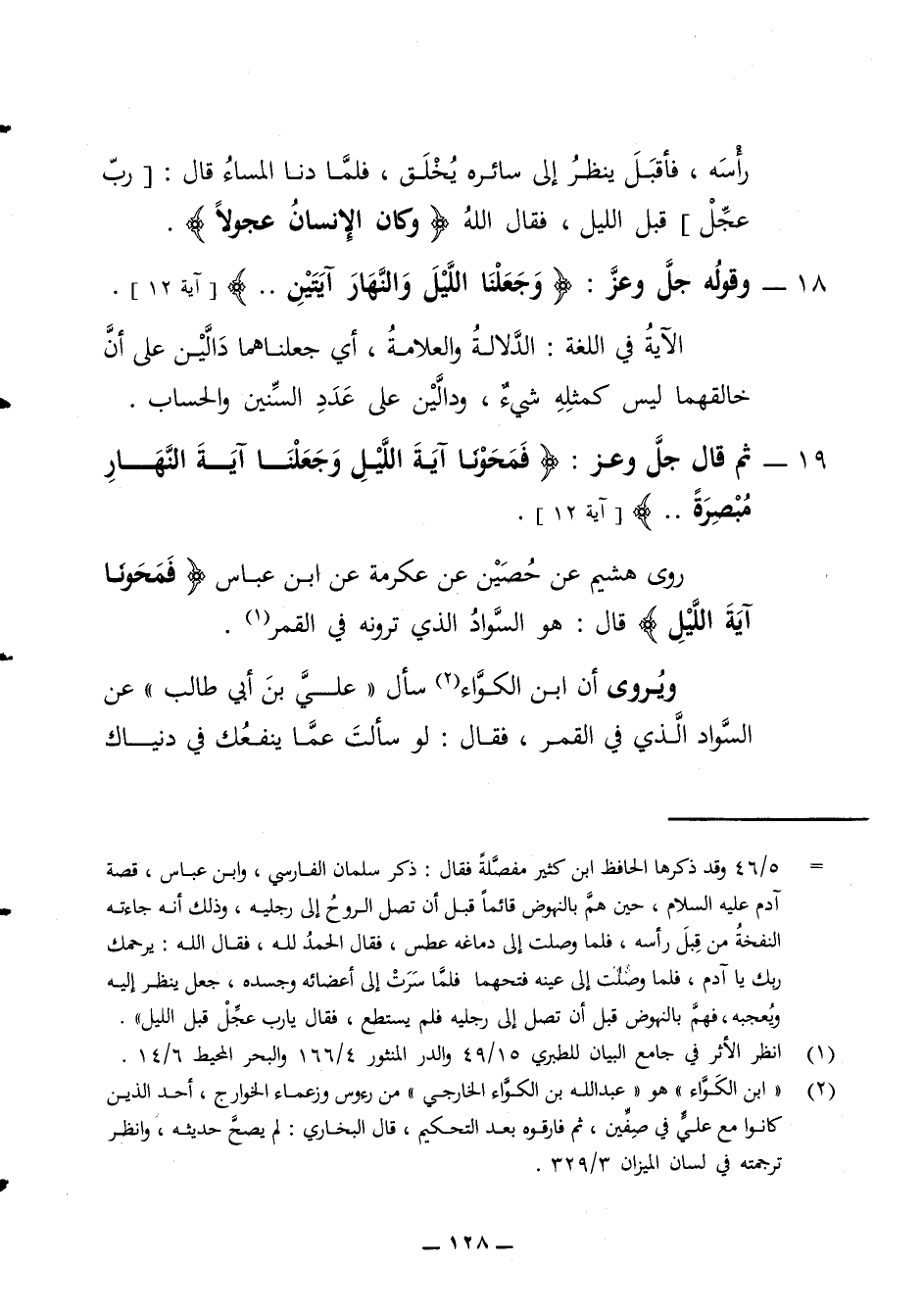 19 - ثم قال جل وعز فمحونا آية الليل وجعلنا آية النهار مبصرة روى هشيم عن حصين عن عكرمة عن ابن عباس فمحونا آية الليل قال هو السواد الذي ترونه في القمر ويروي أن ابن الكواء سأل علي بن أبي طالب عن السواد الذي في القمر فقال لو سألت عما ينفعك في دنياك