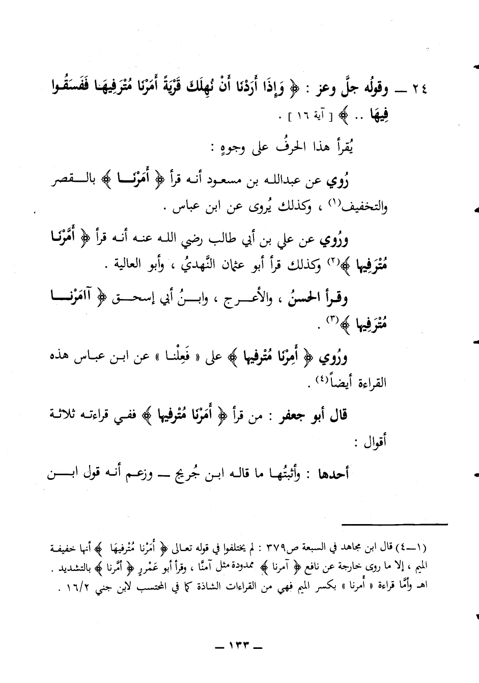 24 - وقوله جل وعز وإذا أردنا أن نهلك قرية أمرنا مترفيها ففسقوا فيها يقرأ هذا الحرف على وجوه روى عن عبد الله بن مسعود أنه قرأ أمرنا بالقصر والتخفيف وكذلك يروي عن ابن عباس وروى عن علي بن أبي طالب رضى الله عنه أنه قرأ أمرنا مترفيها وكذلك قرأ أبو عثمان النهدي وأبو العالية وقرأ الحسن والأعرج وابن أبي اسحق آامرنا مترفيها وروى أمرنا مترفيها على فعلنا عن ابن عباس هذه