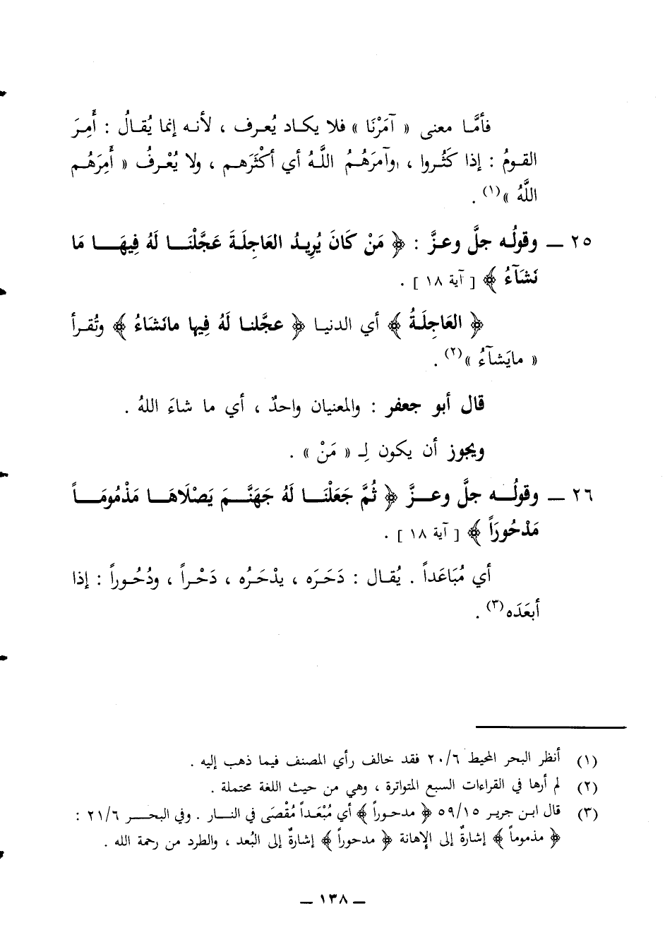 فاما معنى آمرنا فلا يكاد يعرف لأنه إنما يقال أمر القوم إذا كثروا وآمرهم الله أي أكثرهم ولا يعرف أمرهم الله 25 - وقوله جل وعز من كان يريد العاجله فيه عجلنا له فيها ما نشاء العاجلة أي الدنيا عجلنا له فيها ما نشاء وتقرأ ما يشاء قال أبو جعفر والمعنيان واحد أي ما شاء الله ويجوز أن يكون ل من 26 - وقوله جل وعز ثم جعلنا له جهنم يصلاها مذموما مدحورا أي مباعدا يقال دحره يدحره دحرا ودحورا إذا أبعده