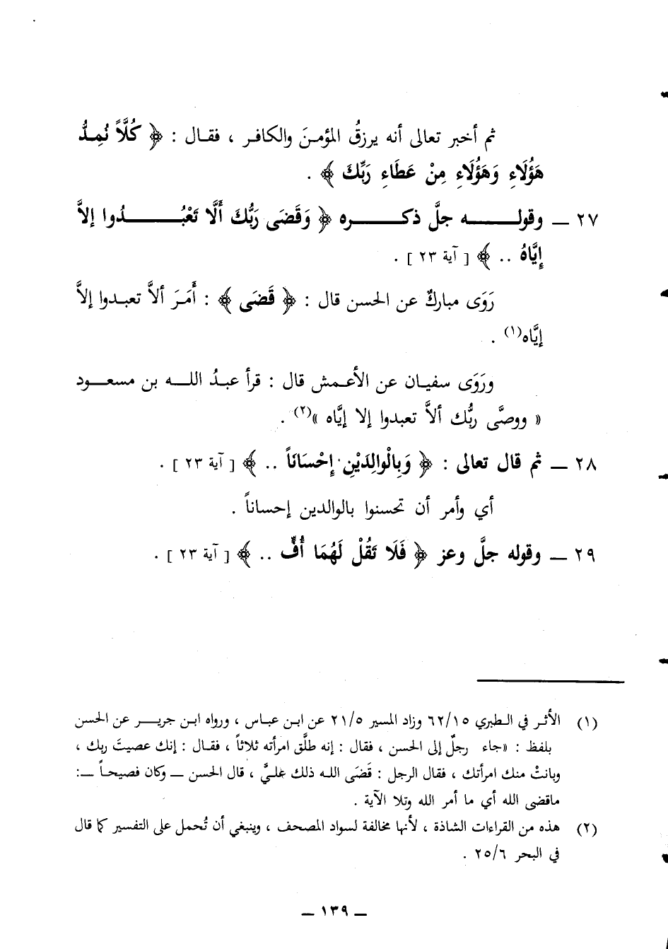 ثم أخبر تعالى أنه يرزق المؤمن والكافر فقال كلا نمد هؤلاء وهؤلاء من عطاء ربك 27 - وقوله جل ذكره وقضى ربك إلا تعبدوا إلا إياه روى مبارك عن الحسن قال قضى أمر ألا تعبدوا إلا إياه وروى سفيان عن الأعمش قال قرأ عبد الله بن مسعود ووصى ربك ألا تعبدوا إلا إياه 28 - ثم قال تعالى وبالوالدين إحسانا أي وأمر أن تحسنوا بالوالدين إحسانا 29 - وقوله جل وعز فلا تقل لهما أف