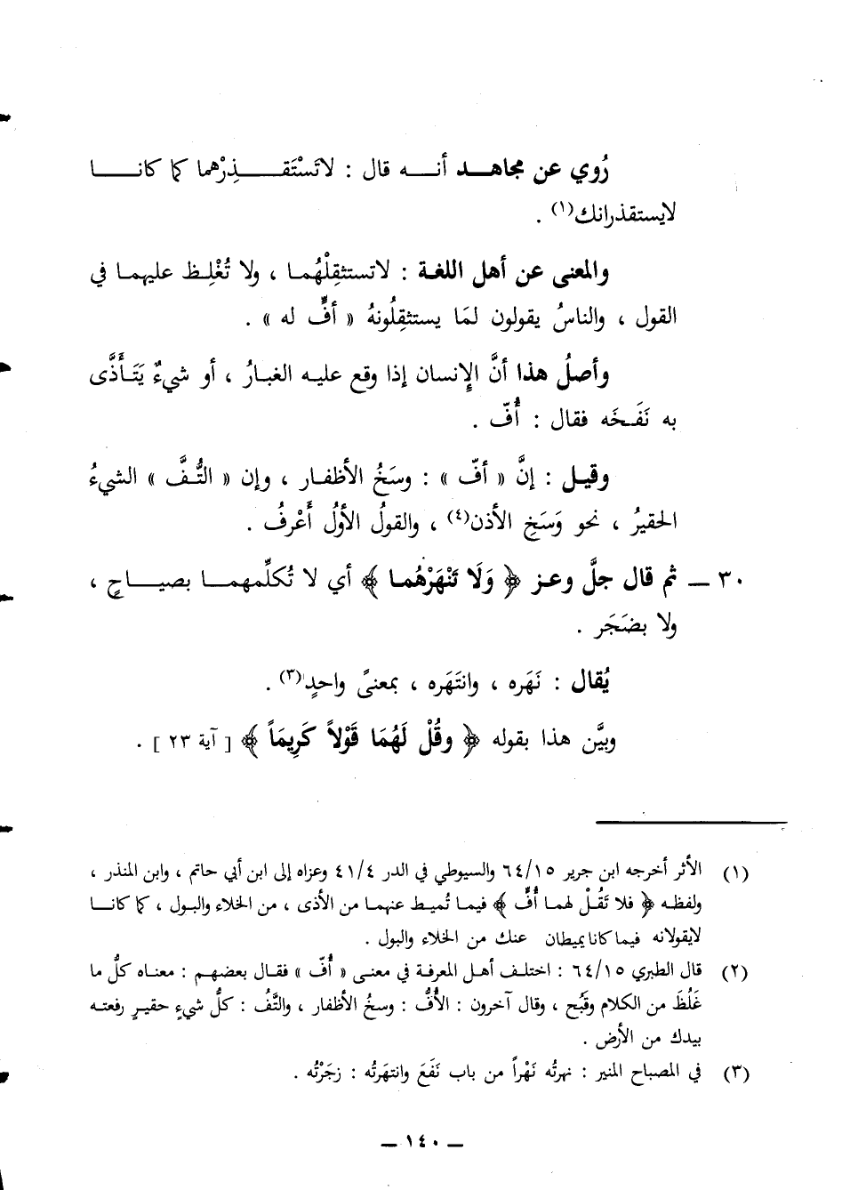 روى عن مجاهد أنه قال لا تستقذرهما صلى كما كانا لا يستقذرانك والمعنى عن أهل اللغة لا تستثقلهما أنه ولا تغلظ عليهما في القول والناس يقولون لما يستثقلونه أف له وأصل هذا أن الإنسان إذا وقع عليه الغبار أو شئ يتأذى به نفخه فقال أف وقيل إن أف وسخ الأظفار وإن التف الشئ الحقير نحو وسخ الأذن والقول الأول أعرف 30 - ثم قال جل وعز ولا تنهرهما أي لا تكلمهما بصياح ولا بضجر يقال نهره وانتهره بمعنى واحد
