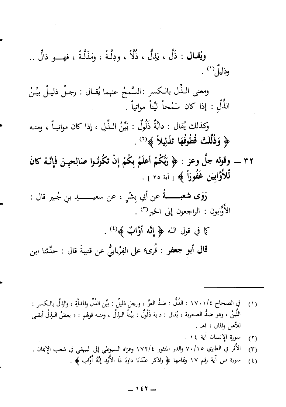 ويقال ذل يذل ذلا وذلة ومذلة فهو ذاك وذليل ومعنى الذل بالكسر السمح عنهما يقال رجل ذليل بين الذل إذا كان سمحا لينا مواتيا وكذلك يقال دابة ذلول بين الذل إذا كان مواتيا ومنه وذللت قطوفها تذليلا 32 - وقوله جل وعز ربكم أعلم بكم إن تكونوا صالحين فإنه كان