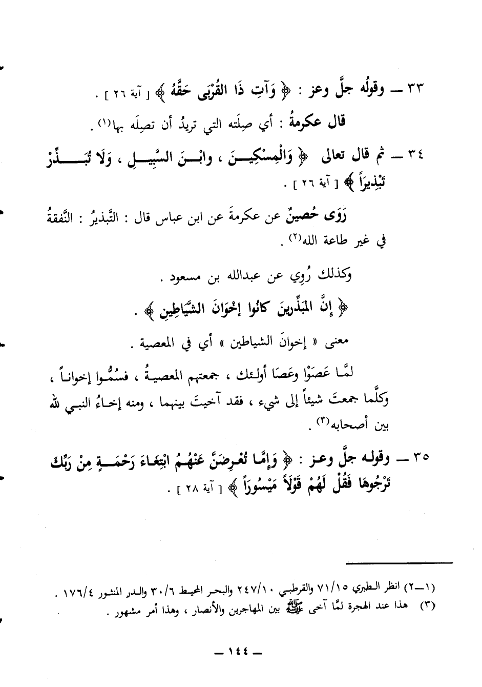 33 - وقوله جل وعز وآت ذا القربى حقه قال عكرمة أي صلته التي تريد أن تصله بها 34 - ثم قال تعالى والمسكين وابن السبيل ولا تبذر تبذيرا
