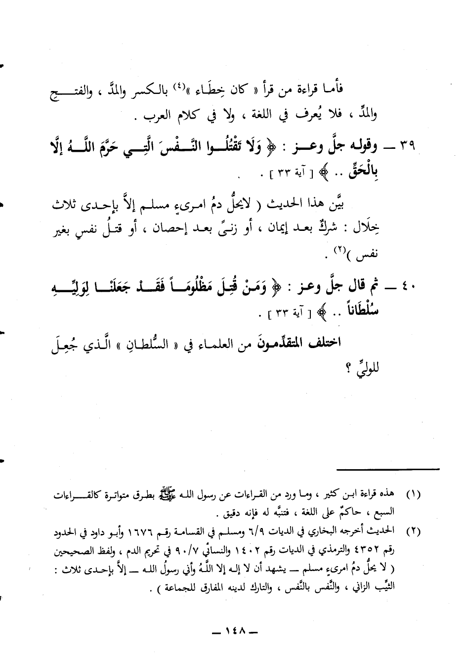 فأما قراءة من قرأ كان خطاء بالكسر والمد والفتح والمد فلا يعرف في اللغة ولا في كلام العرب 39 - وقوله جل وعز ولا تقتلوا النفس التي حرم الله إلا بالحق بين هذا الحديث لا يحل دم أمرئ مسلم إلا بإحدى ثلاث خلال شرك بعد إيمان أو زنى بعد إحصان أو قتل نفس بغير نفس 40 - ثم قال جل وعز ومن قتل مظلوما فقد جعلنا لوليه سلطانا اختلف المتقدمون من العلماء في السلطان الذي جعل للولي