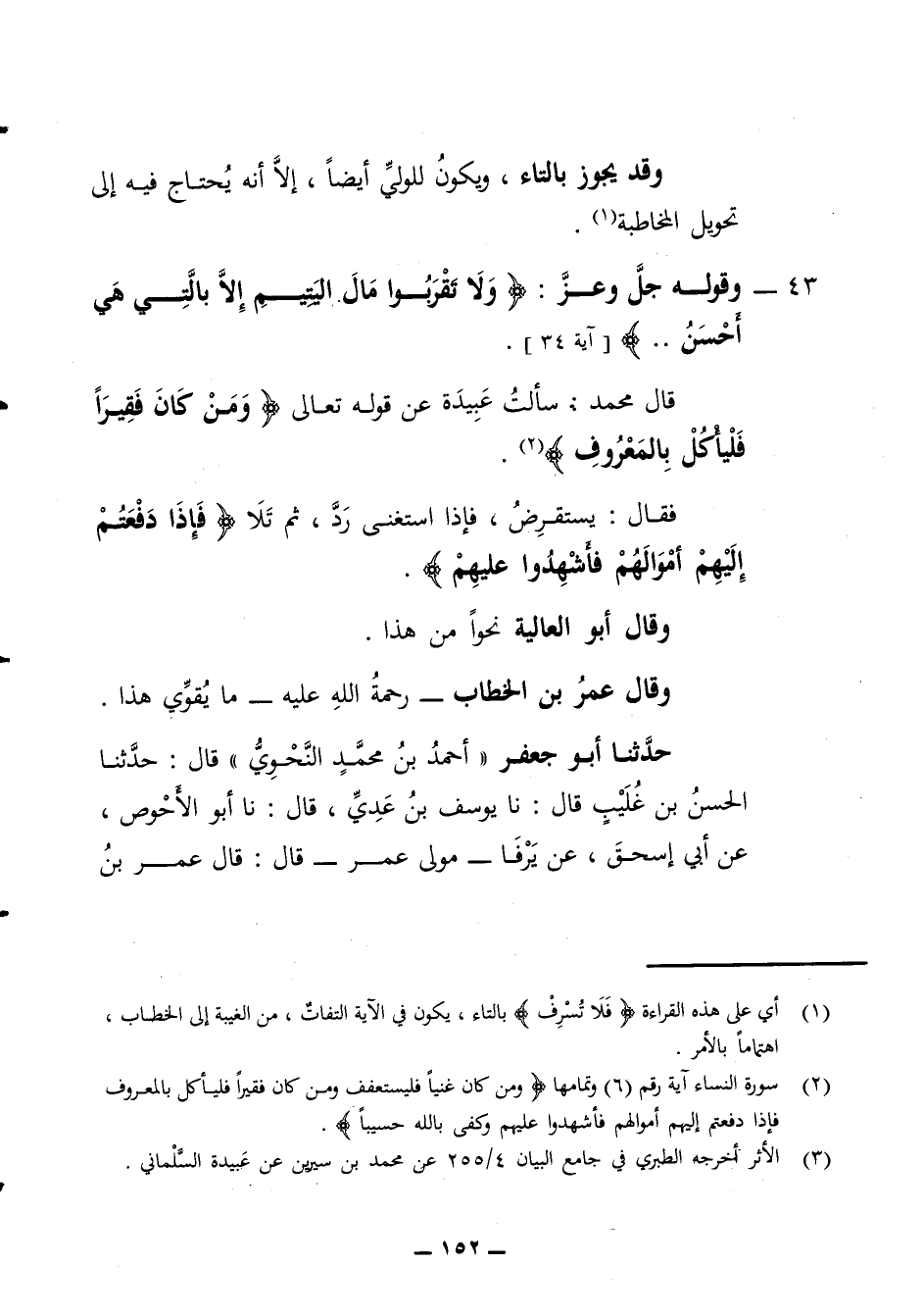 تحويل المخاطبة 43 - وقوله جل وعز ولا تقربوا مال اليتيم إلا بالتي هي أحسن قال محمد سألت عبيدة عن قوله تعالى ومن كان فقيرا فليأكل بالمعروف فقال يستقرض فإذا استغنى رد ثم تلا فإذا دفعتم إليهم أموالهم فأشهدوا عليهم وقال أبو العالية نحوا من هذا وقال عمر بن الخطاب رحمة الله عليه ما يقوي هذا حدثنا أبو جعفر أحمد بن محمد النحوي قال حدثنا الحسن بن غليب قال نا يوسف بن عدي قال نا أبو الأحوص عن أبي إسحق عن يرفا مولى عمر قال قال عمر بن