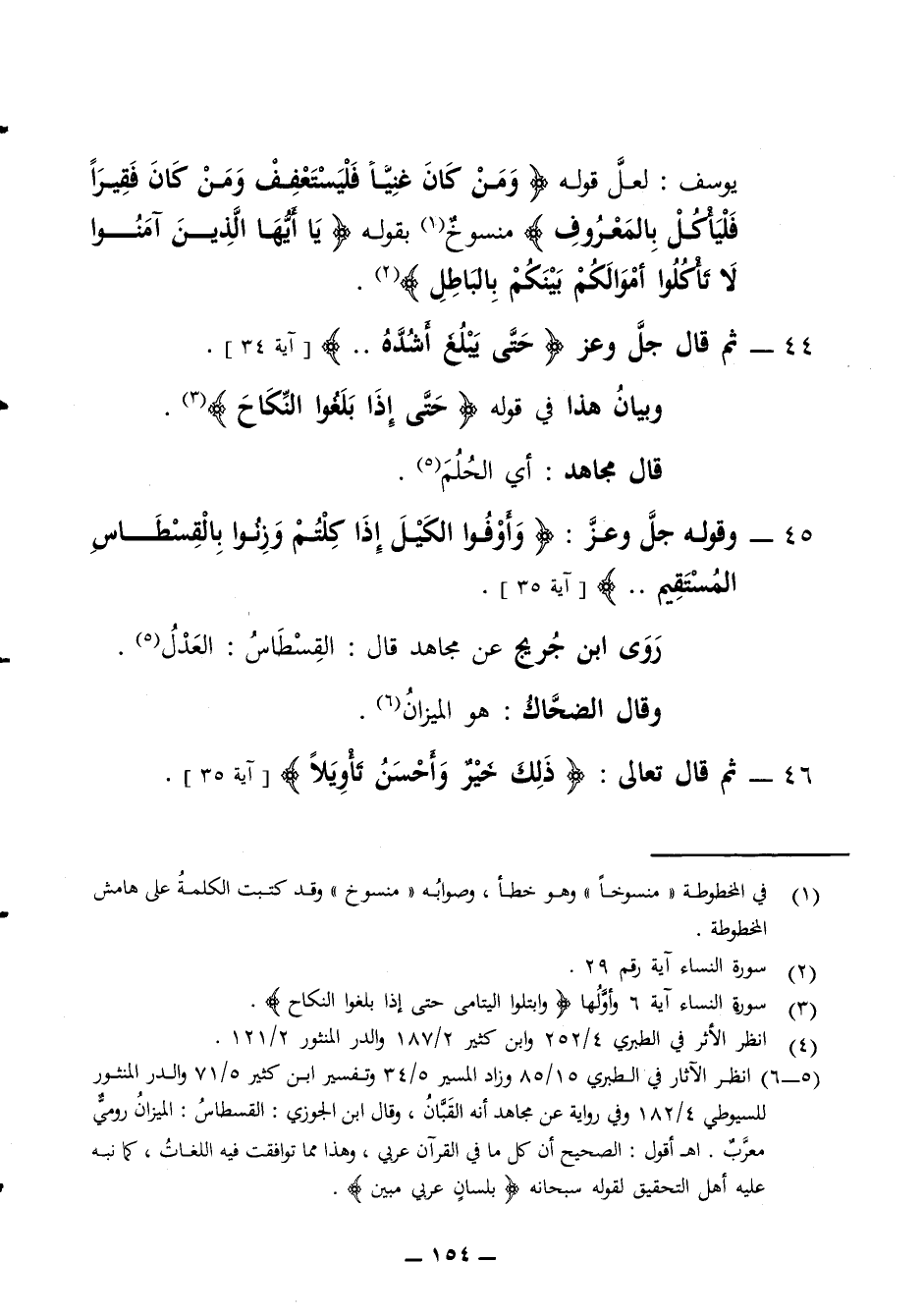 يوسف لعل قوله ومن كان غنيا فليستعفف ومن كان فقيرا فليأكل بالمعروف منسوخ بقوله يا أيها الذين آمنو لا تأكلوا أموالكم بينكم بالباطل 44 - ثم قال جل وعز حتى يبلغ أشده وبيان هذا في قوله حتى إذا بلغوا النكاح قال مجاهد أي الحلم 45 - وقوله جل وعز وأوفوا الكيل إذا كلتم وزنوا بالقسطاس المستقيم روى ابن جريج عن مجاهد قال القسطاس العدل وقال الضحاك هو الميزان 46 - ثم قال تعالى ذلك خير وأحسن تأويلا