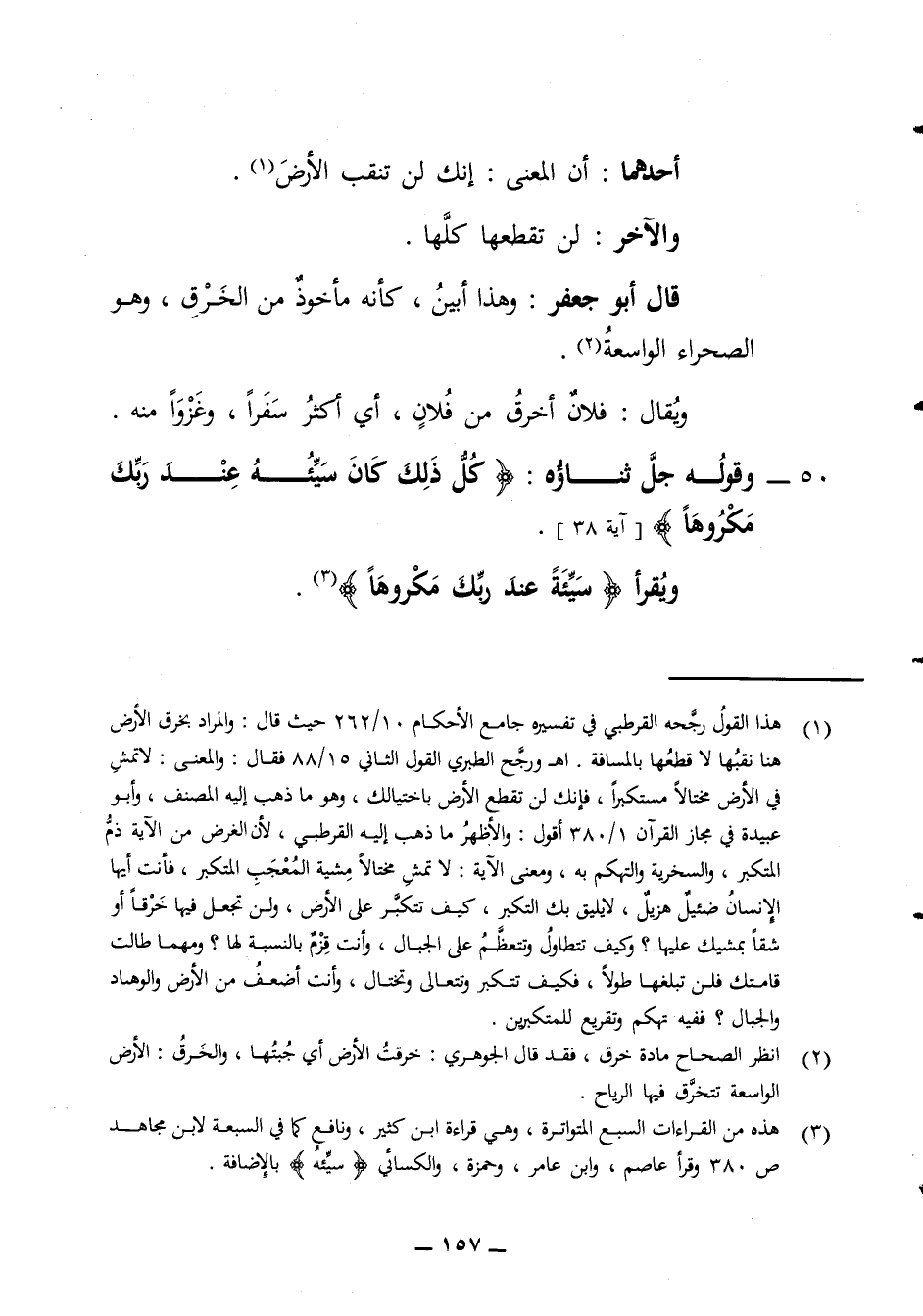 أحدهما أن المعنى إنك لن تنقب الأرض والآخر لن تقطعها كلها قال أبو جعفر وهذا أبين كأنه مأخوذ من الخرق وهو الصحراء الواسعة ويقال فلان أخرق من فلان أي أكثر سفرا وغزوا منه