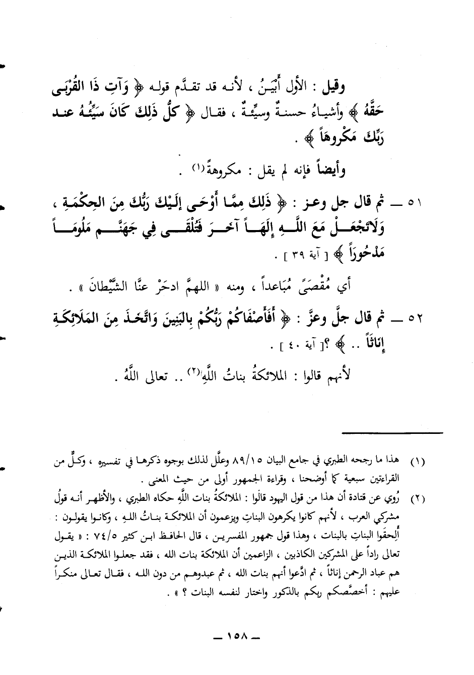 وقيل الأول أبين لأنه قد تقدم قوله وآت ذا القربى حقه وأشياء حسنة وسيئة فقال كل ذلك كان سيئة عند ربك مكروها وأيضا فإنه لم يقل مكروهة 51 - ثم قال جل وعز ذلك مما اوحى إليك ربك من الحكمة ولا تجعل مع الله إلها آخر فتلقى في جهنم ملوما مدحورا أي مقصى مباعدا ومنه اللهم ادحر عنا الشيطان 52 - ثم قال جل وعز أفأصفاكم ربكم بالبنين واتخذ من الملائكة إناثا لأنهم قالوا الملائكة بنات الله تعالى الله