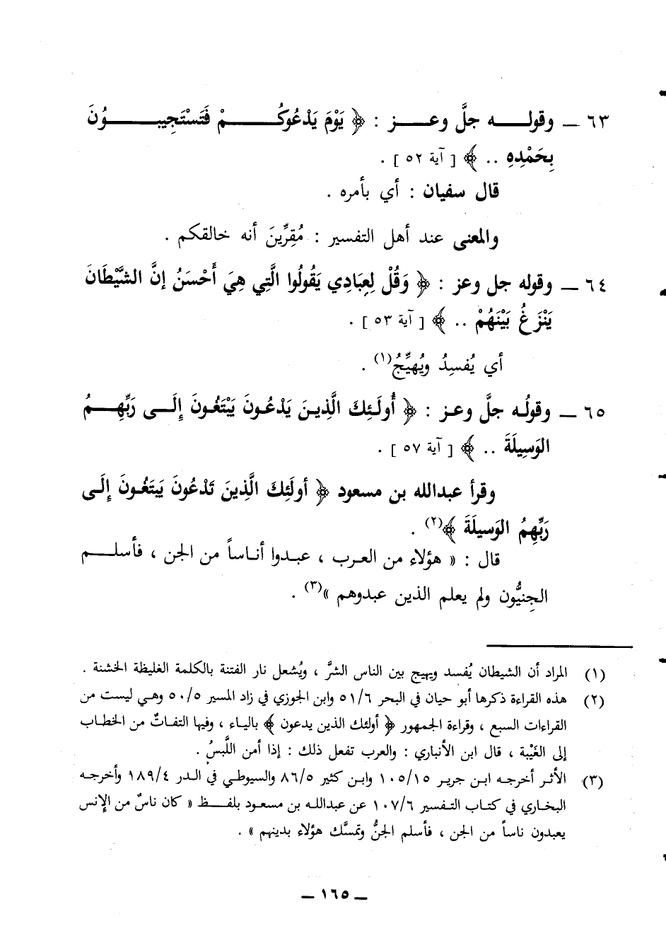 63 - وقوله جل وعز يوم يدعوكم فتستجيبون بحمده قال سفيان أي بأمره والمعنى عند أهل التفسير مقرين أنه خالقكم 64 - وقوله جل وعز وقل لعبادي يقولوا التي هي أحسن إن الشيطان ينزغ بينهم أي يفسد ويهيج 65 - وقوله جل وعز أولئك الذين يدعون يبتغون الى ربهم الوسيلة وقرأ عبد الله بن مسعود أولئك الذين تدعون يبتغون الى ربهم الوسيلة قال هؤلاء من العرب عبدوا أناسا من الجن فاسلم الجنيون ولم يعلم الذين عبدوهم