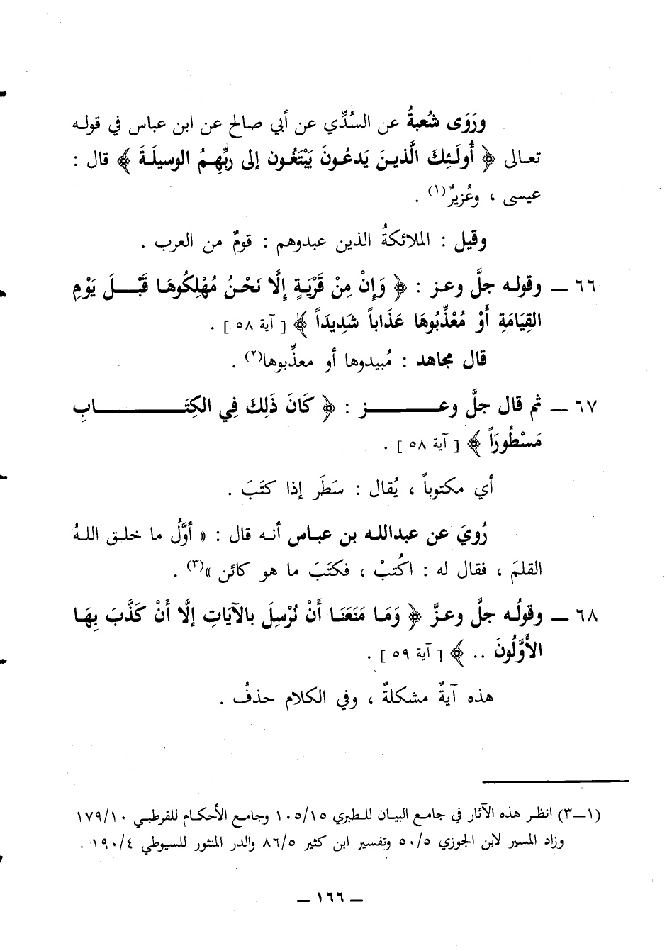 وروى شعبة عن السدي عن ابي صالح عن ابن عباس في قوله تعالى أولئك الذين يدعون يبتغون الى ربهم الوسيلة قال عيسى وعزير وقيل الملائكة الذين عبدوهم قوم من العرب 66 - وقوله جل وعز وإن من قرية إلا نحن مهلكوها قبل يوم القيامة أو معذبوها عذابا شديدا قال مجاهد مبيدوها أو معذبوها 67 - ثم قال جل وعز كان ذلك في الكتاب