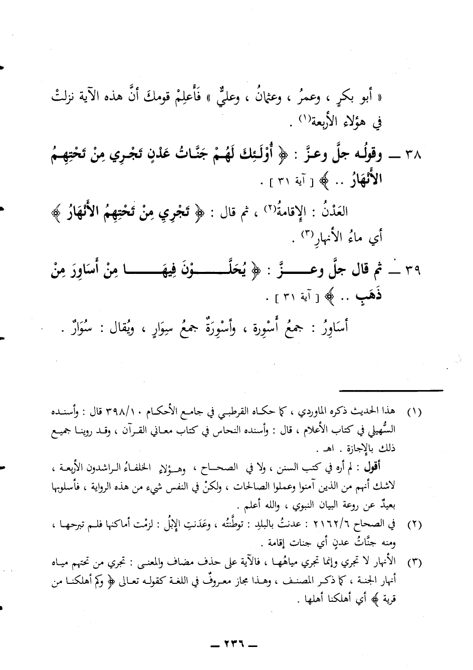 أبو بكر وعمر وعثمان وعلي فاعلم قومك أن هذا الآية نزلت في هؤلاء الأربعة 38 وقوله جل وعز أولئك لهم جنات عدن تجري من تحتهم الأنهار العدن الإقامة ثم قال تجري من تحتهم الأنهار أي ماء الأنهار 39 - ثم قال جل وعز يحلون فيها من أساور من ذهب أساور جمع أسورة وأسورة جمع سوار ويقال سوار