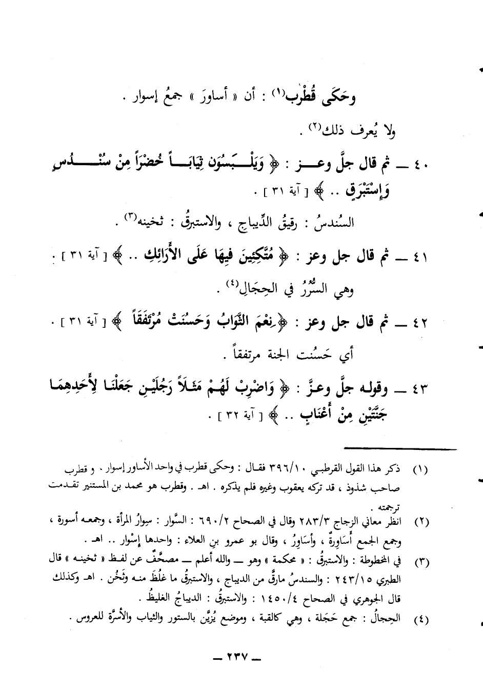 وحكى قطرب أن أساور جمع أسوار ولا يعرف ذلك 40 - ثم قال جل وعز ويلبسون ثيابا خضرا من سندس وإستبرق السندس رقيق الديباج