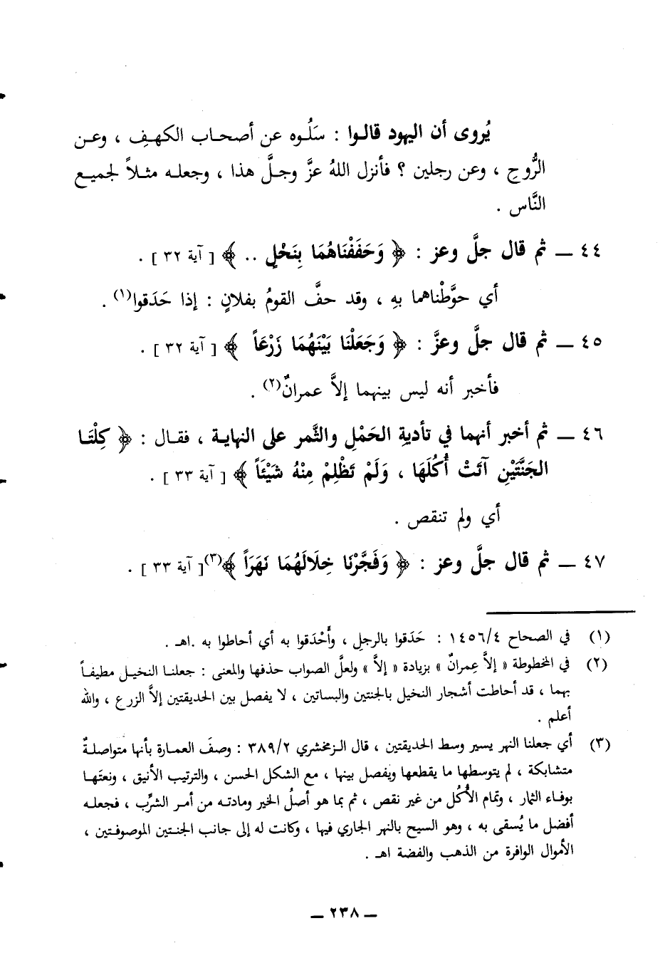 يروى أن اليهود قالوا سلوه عن أصحاب الكهف وعن الروح وعن رجلين فأنزل الله عز وجل هذا وجعله مثلا لجميع الناس 44 - ثم قال جل وعز وحففناهما بنخل أي حوطناهما (به وقد حف القوم بفلان إذا حدقوا 45 - ثم قال جل وعز وجعلنا بينهما زرعا فأخبر أنه ليس بينهما إلا عمران 46 - ثم أخبر أنهما في تأدية الحمل والثمر على النهاية فقال كلتا الجنتين آتت أكلها ولم تظلم منه شيئا أي ولم تنقص 47 - ثم قال جل وعز وفجرنا خلالهما نهرا