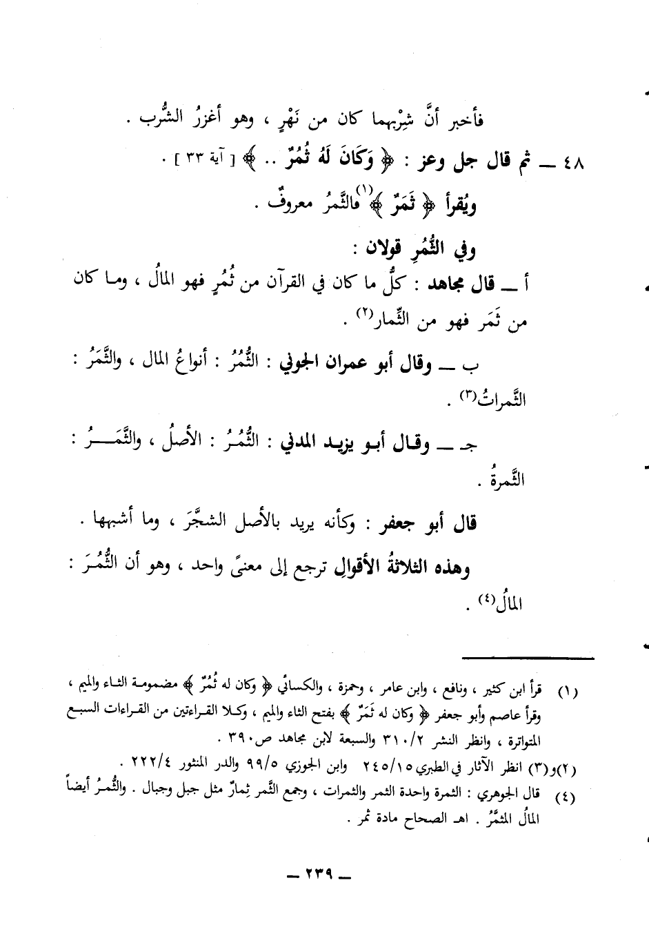 ويقرأ ثمر فالثمر معروف وفي الثمر قولان أقال مجاهد كل ما كان في القرآن من ثمر فهو المال وما كان من ثمر فهو من الثمار ب وقال أبو عمران الجوني الثمر أنواع المال والثمر الثمرات ج وقال أبو يزيد المدني الثمر الأصل والثمر الثمرة قال أبو جعفر وكأنه يريد بالأصل الشجر وما أشبهها وهذه الثلاثة الأقوال ترجع الى معنى واحد وهو ان الثمر المال