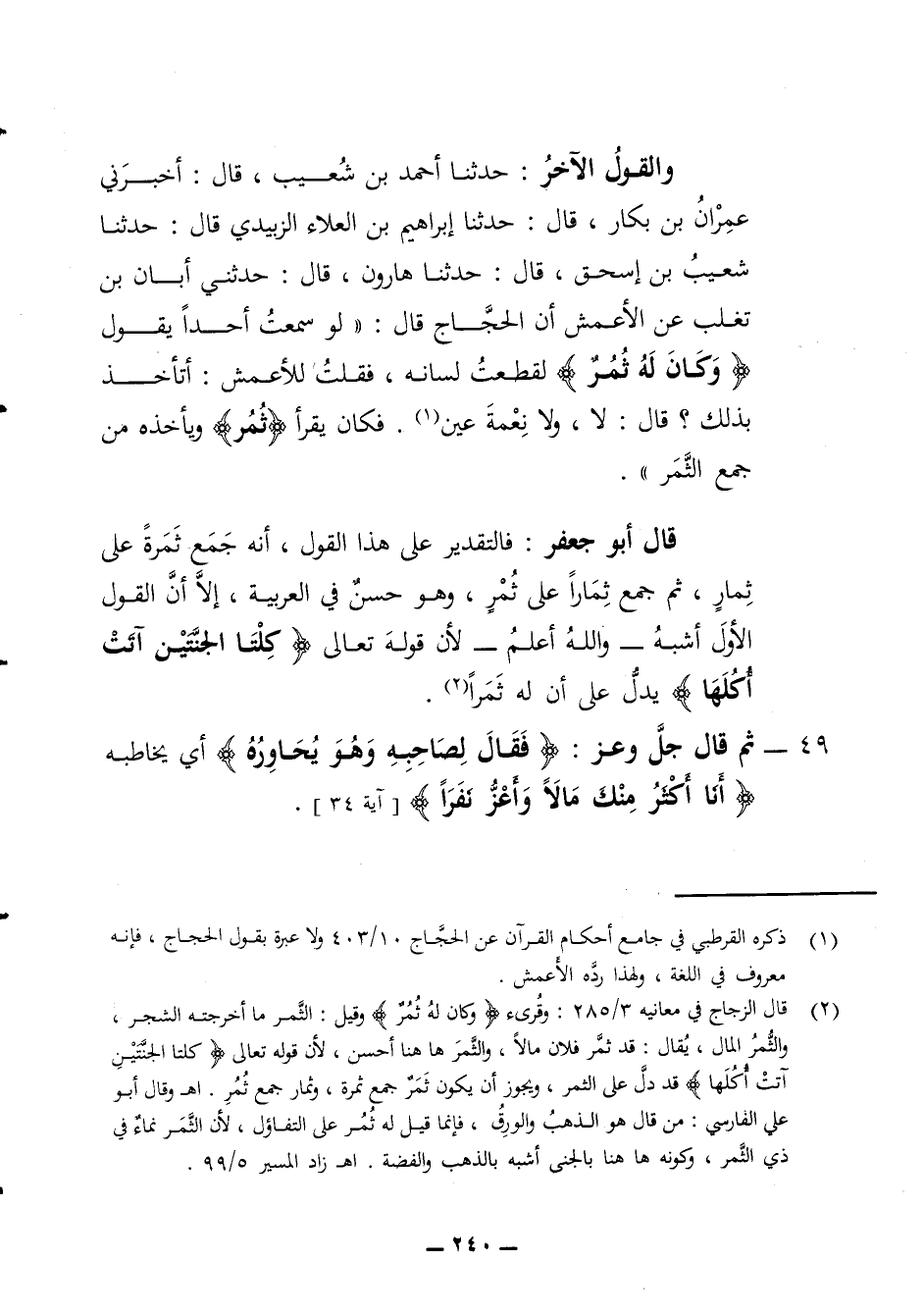 والقول الآخر حدثنا أحمد بن شعيب قال أخبرني عمران بن بكار قال حدثنا إبراهيم بن العلاء الزبيدي قال حدثنا شعيب بن إسحق قال حدثنا هارون قال حدثني أبان بن تغلب عن الأعمش أن الحجاج قال لو سمعت أحدا يقول وكان له ثمر لقطعت لسانه فقلت للأعمش اتأخذ بذلك قال لا ولا نعمة عين فكان يقرأ ثمر ويأخذه من جمع الثمر قال أبو جعفر فالتقدير على هذا القول أنه جمع ثمرة على ثمار ثم جمع ثمارا على ثمر وهو حسن في العربية إلا أن القول الأول أشبه والله أعلم لأن قوله تعالى كلتا الجنتين آتت