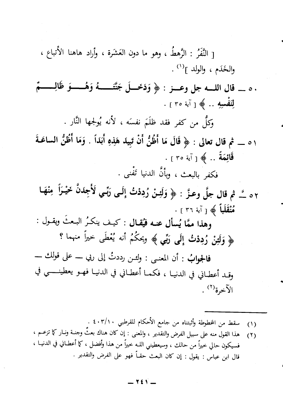 النفر الرهط وهو ما دون العشرة وأراد ها هنا الأتباع والخدم والولد 50 - قال الله جل وعز ودخل جنته وهو ظالم لنفسه وكل من كفر فقد ظلم نفسه لأنه يولجها ما النار 51 - ثم قال تعالى قال ما أظن أن تبيد هذه أبدا وما أظن الساعة قائمة فكفر بالبعث وبأن الدنيا تفنى 52 - ثم قال جل وعز ولئن رددت الى ربي لأجدن خيرا منها منقلبا وهذا مما يسأل عنه فيقال كيف ينكر البعث ويقول ولئن رددت الى ربي ويحكم أنه يعطي خيرا منهما فالجواب أن المعنى ولئن رددت الى ربي على قولك وقد أعطاني في الدنيا فكما أعطاني في الدنيا فهو يعطيني في الآخرة