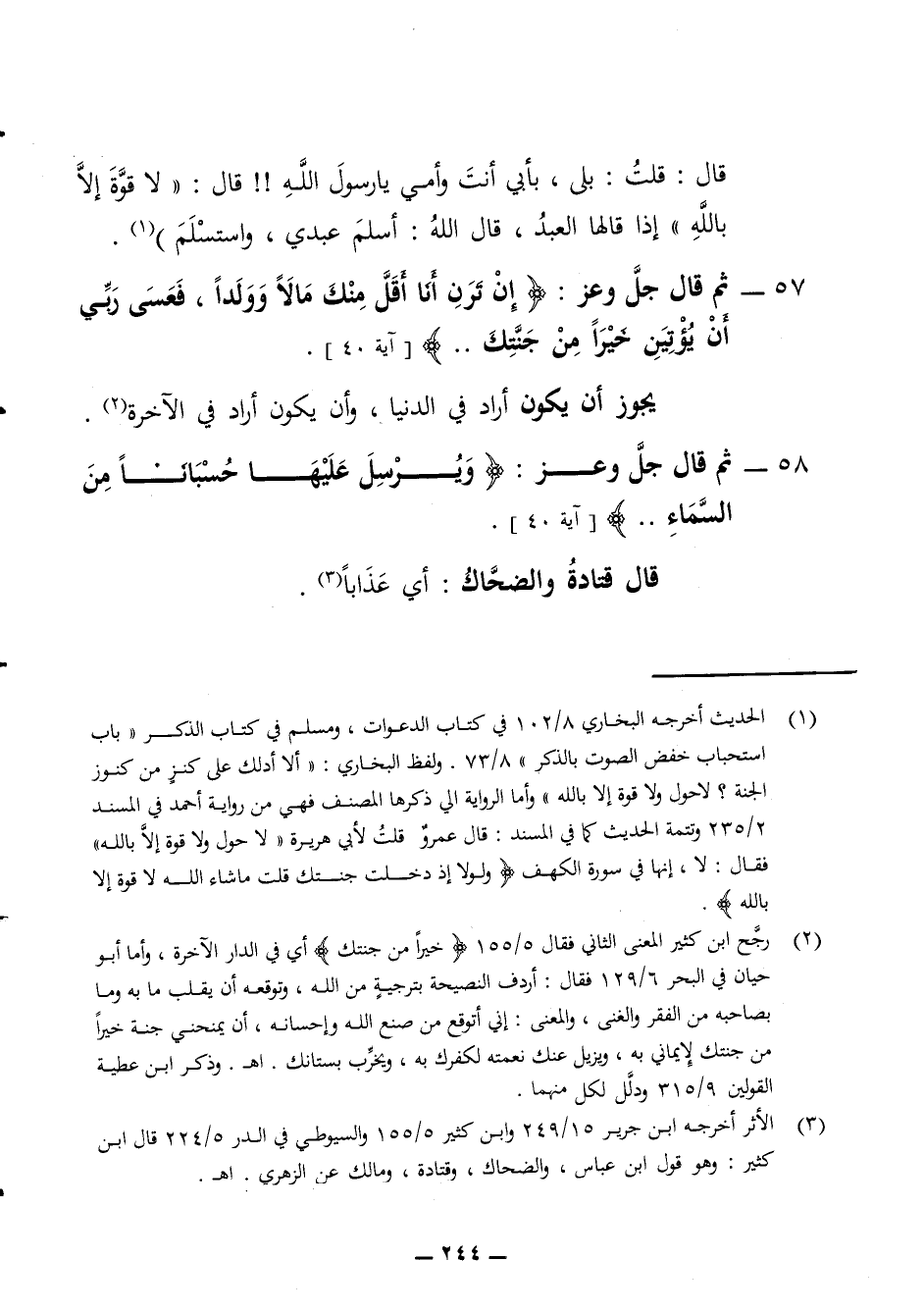 57 - ثم قال جل وعز إن ترن أنا أقل منك مالا وولدا فعسى ربي أن يؤتين خيرا من جنتك يجوز أن يكون أراد في الدنيا وأن يكون أراد في الآخرة 58 - ثم قال جل وعز ويرسل عليها حسبانا من السماء قال قتادة والضحاك أي عذابا