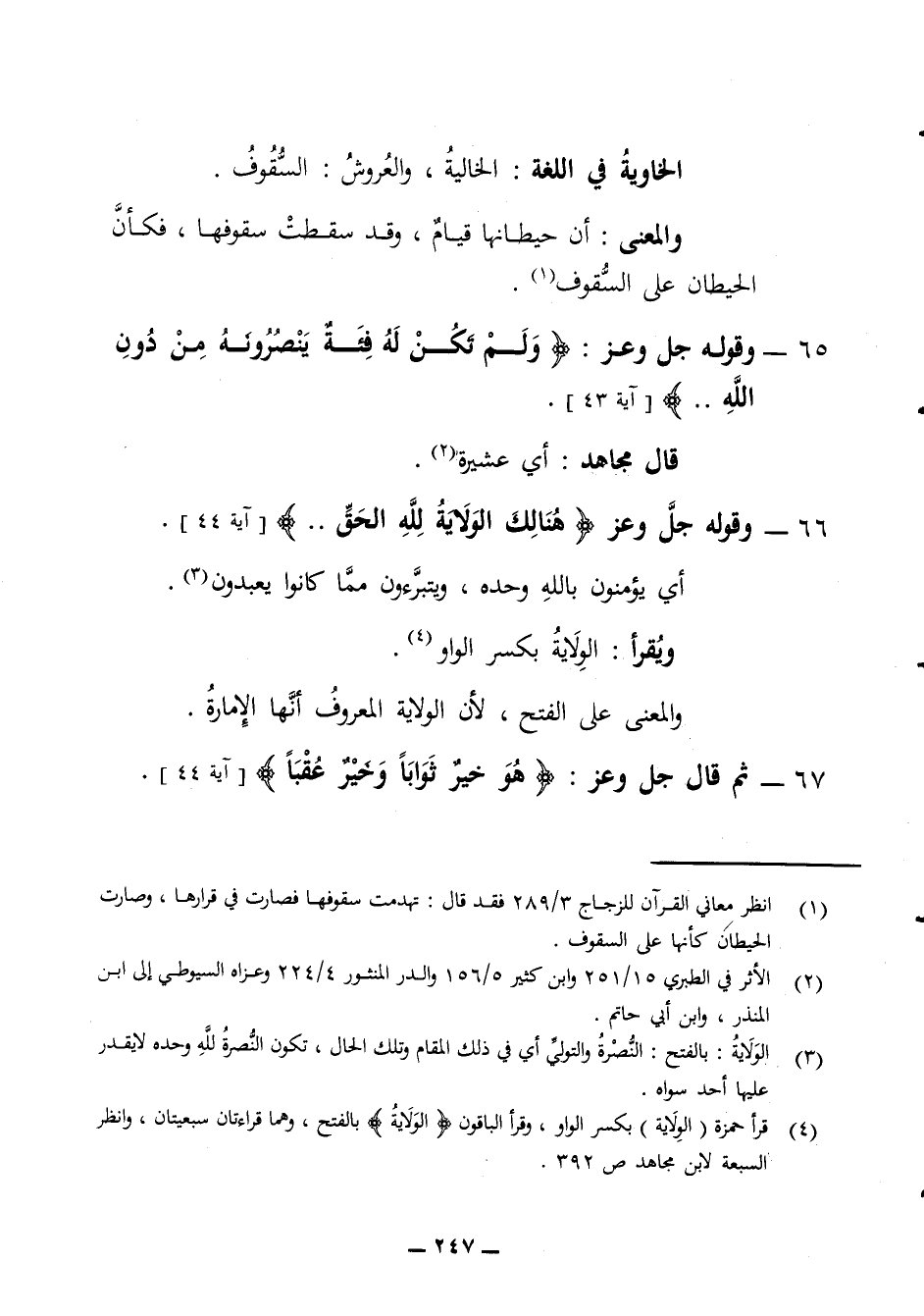 الخاوية في اللغة الخالية والعروش السقوف والمعنى أن حيطانها قيام وقد سقطت سقوفها فكان الحيطان على السقوف 65 - وقوله جل وعز ولم تكن له فئة ينصرونه من دون الله قال مجاهد أي عشيرة 66 - وقوله جل وعز هنالك الولاية لله الحق أي يؤمنون بالله وحده ويتبرءون مما كانوا يعبدون ويقرأ الولاية بكسر الواو والمعنى على الفتح لأن الولاية المعروف أنها الإمارة 67 - ثم قال جل وعز هو خير ثوابا وخير عقبا