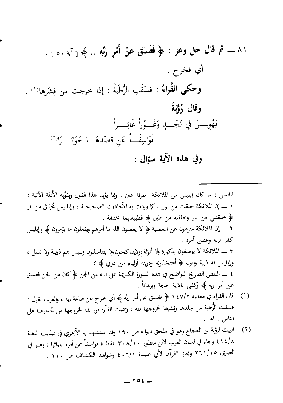 81 - ثم قال جل وعز ففسق عن أمر ربه أي فخرج وحكى الفراء فسقت الرطبة إذا خرجت من قشرها وقال رؤبة يهوين في نجد وغورا غائرا فواسقا عن قصدها جوائرا وفي هذه الآية سؤال