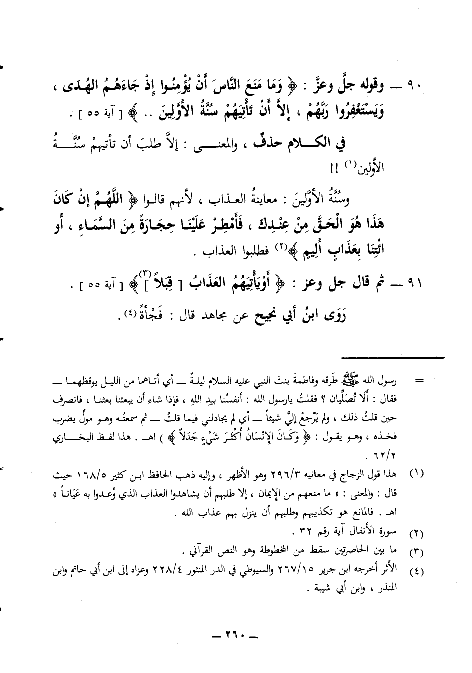 90 - وقوله جل وعز وما منع الناس أن يؤمنوا إذ جاءهم الهدى ويستغفروا ربهم إلا أن تأتيهم سنة الأولين في الكلام حذف والمعنى إلا طلب أن تأتيهم سنة الأولين وسنة الأولين معاينة العذاب لأنهم قالوا اللهم إن كان هذا هو الحق من عندك فأمطر علينا حجارة من السماء أو ائتنا بعذاب أليم فطلبوا العذاب 91 - ثم قال جل وعز أو يأتيهم في العذاب قبلا روى ابن أبي نجيح عن مجاهد قال فجأة