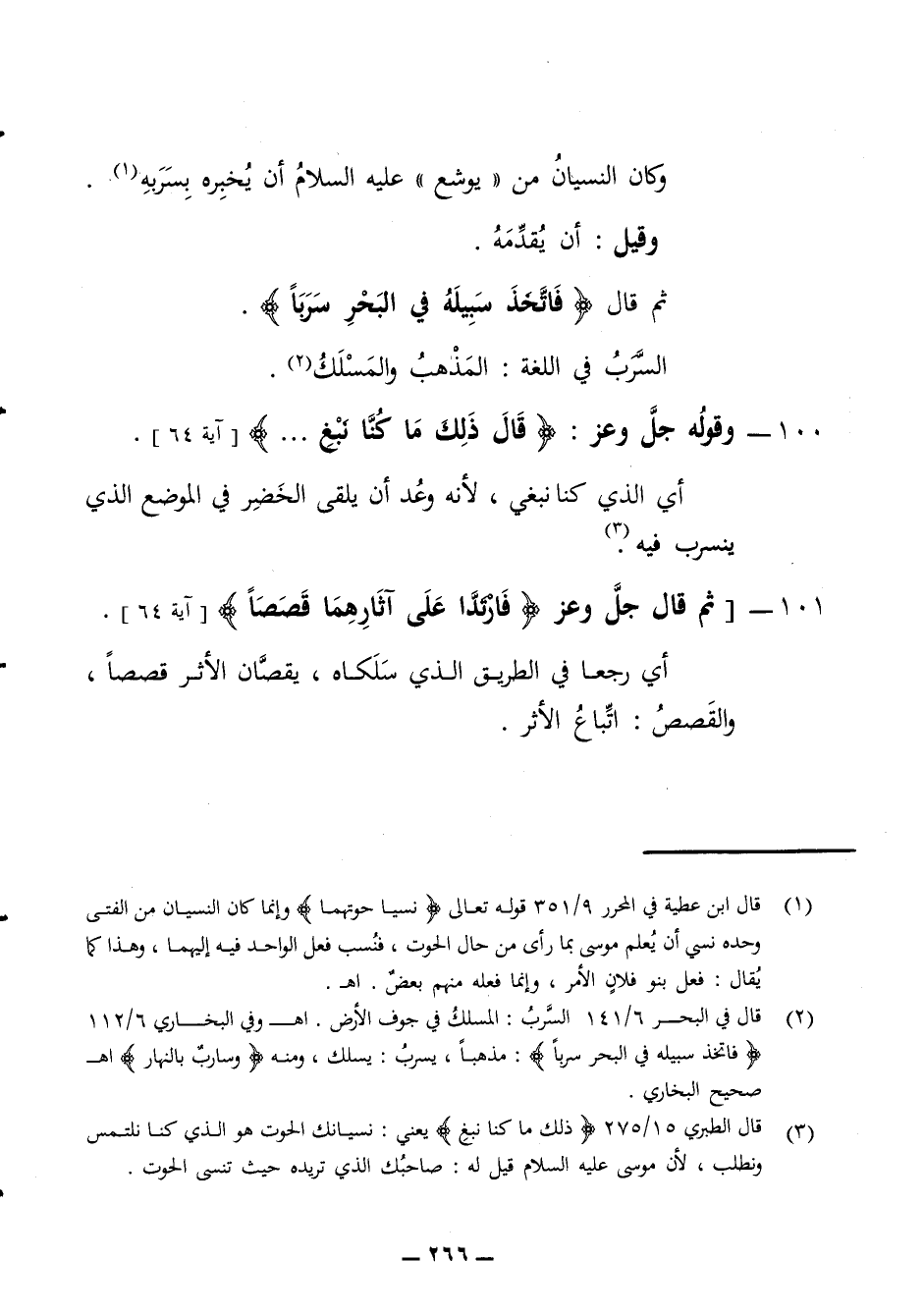 وكان النسيان من يوشع عليه السلام يخبره بسربه بن وقيل أن يقدمه ثم قال فاتخذ سيله في البحر سربا السرب في اللغة المذهب والمسلك 100 - وقوله جل وعز قال ذلك ما كنا نبغ أي الذي كنا نبغي لأنه وعد أن يلقى الخضر في الموضع الذي ينسرب فيه 101 - ثم قال جل وعز فارتدا على آثارهم قصصا أي رجعا في الطريق الذي سلكاه يقصان الأثر قصصا والقصص أتباع الأثر