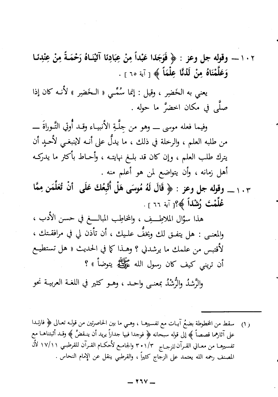 من طلبه العلم والرحلة في ذلك ما يدل على أنه لا ينبغي لأحد أن يترك طلب العلم وإن كان قد بلغ نهايته وأحاط بأكثر ما يدركه أهل زمانه وأن يتواضع لمن هو أعلم منه 103 - وقوله جل وعز قال له موسى هل اتبعك على أن تعلمن مما علمت رشدا هذا سؤال الملاطف والمخاطب المبالغ في حسن الأدب والمعنى هل يتفق لك ويخف عليك أن تأذن لي في مرافقتك لأقتبس من علمك ما يرشدني وهذا كما في الحديث هل تستطيع أن تريني كيف كان رسول الله (ص) يتوضأ والرشد والرشد بمعنى واحد وهو كثير في اللغة العربية نحو