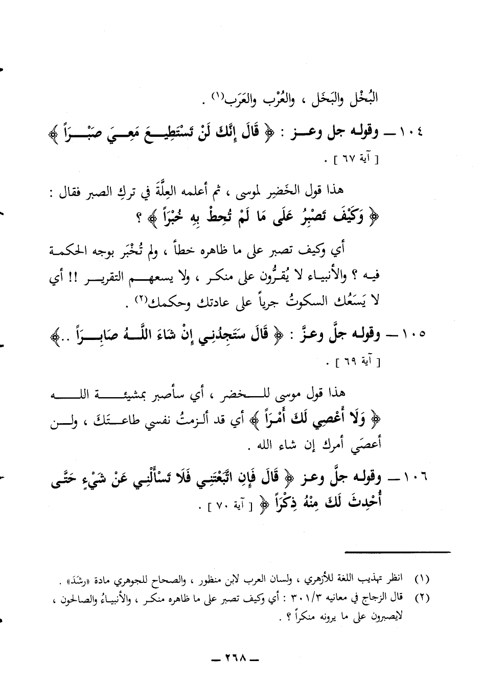 البخل والبخل والعرب والعرب 104 - وقوله جل وعز قال إنك لن تستطيع معي صبرا هذا قول الخضر لموسى ثم أعلمه العلة في ترك الصبر فقال وكيف تصبر على ما لم تحط به خبرا أي وكيف تصبر على ما ظاهره خطأ ولم تخبر بوجه الحكمة فيه والأنبياء لا يقرون على منكر ولا يسعهم التقرير أي لا يسعك السكوت جريا على عادتك وحكمك 105 - وقوله جل وعز قال ستجدني إن شاء الله صابرا هذا قول موسى للخضر أي سأصبر بمشيئة الله ولا أعصي لك أمرا أي قد ألزمت نفسي طاعتك ولن أعصي أمرك إن شاء الله