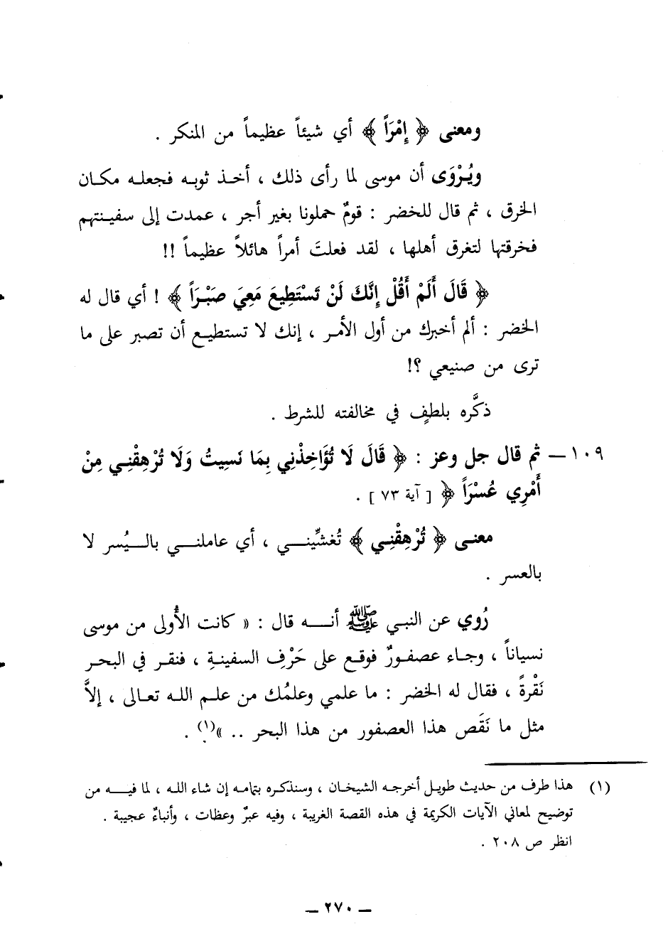 الخرق ثم قال للخضر قوم حملونا بغير أجر عمدت الى سفينتهم فخرقتها لتغرق أهلها لقد فعلت أمرا هائلا عظيما قال ألم أقل إنك لن تستطيع معي صبرا أي قال له الخضر ألم أخبرك من أول الأمر إنك لا تستطيع أن تصبر على ما ترى من صنيعي ذكره بلطف في مخالفته للشرط 109 - ثم قال جل وعز قال لا تؤاخذني بما نسيت ولا ترهقني من أمري عسرا معنى ترهقني تغشيني سنة أي عاملني باليسر لا بالعسر روى عن النبي (ص) أنه قال كانت الأولى من موسى نسيانا وجاء عصفور فوقع على حرف السفينة فنقر في البحر نقرة فقال له الخضر ما علمي وعلمك من علم الله تعالى إلا مثل ما نقص هذا العصفور من هذا البحر