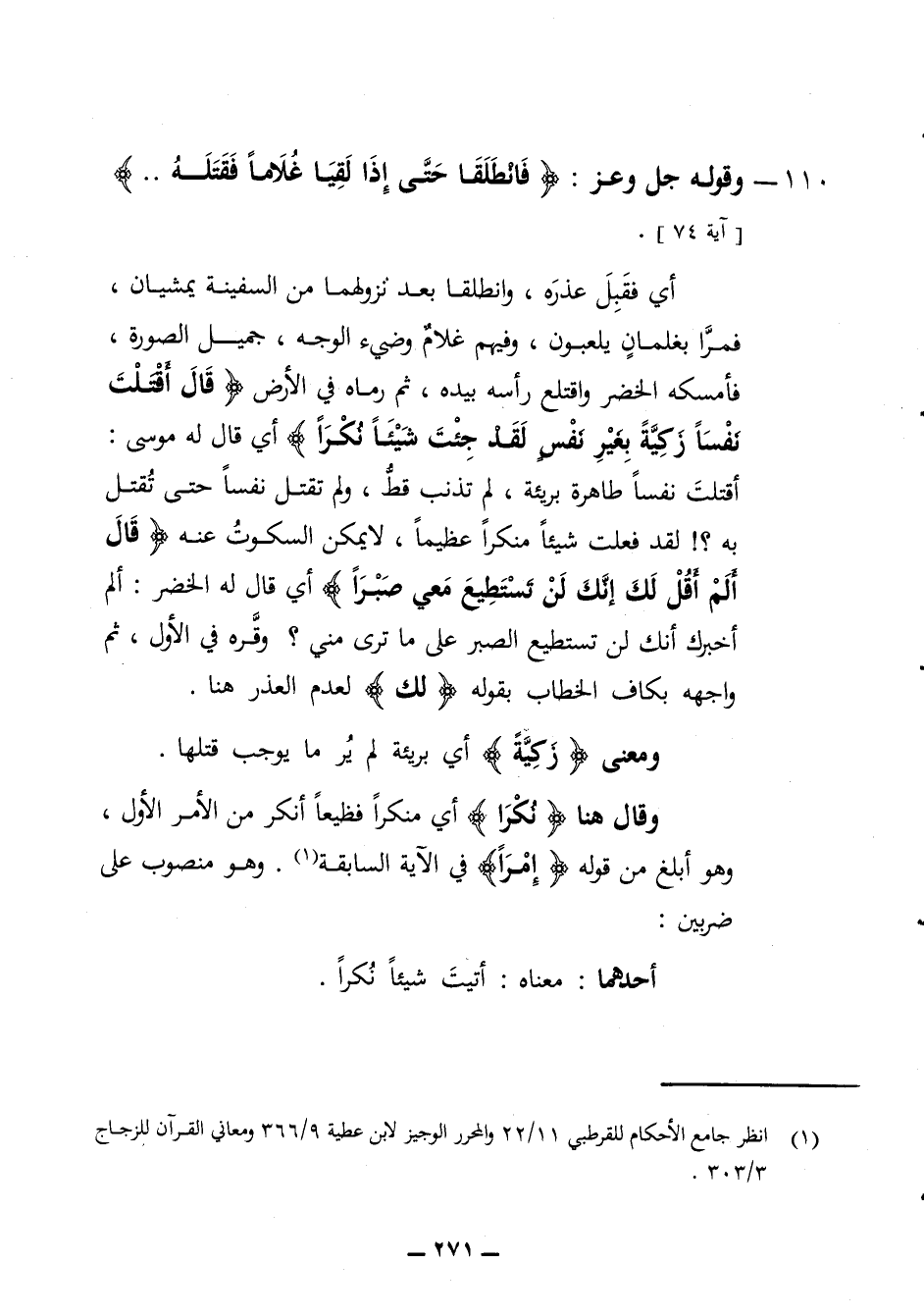 110 - وقوله جل وعز فانطلقا حتى إذا لقيا غلاما فقتله أي فقبل عذره وانطلقا بعد نزولهما من عمرو السفينة يمشيان فمرا بغلمان قبل يلعبون وفيهم غلام وضئ الوجه جميل الصورة فأمسكه الخضر واقتلع رأسه بيده ثم رماه في الأرض قال أقتلت نفسا زكية بغير نفس لقد جئت شيئا نكرا أي قال له موسى أقتلت نفسا طاهرة بريئة لم تذنب قط ولم تقتل نفسا حتى تقتل به لقد فعلت شيئا منكرا عظيما لا يمكن السكوت عنه قال ألم أقل لك إنك لن تستطيع معي صبرا أي قال له الخضر ألم