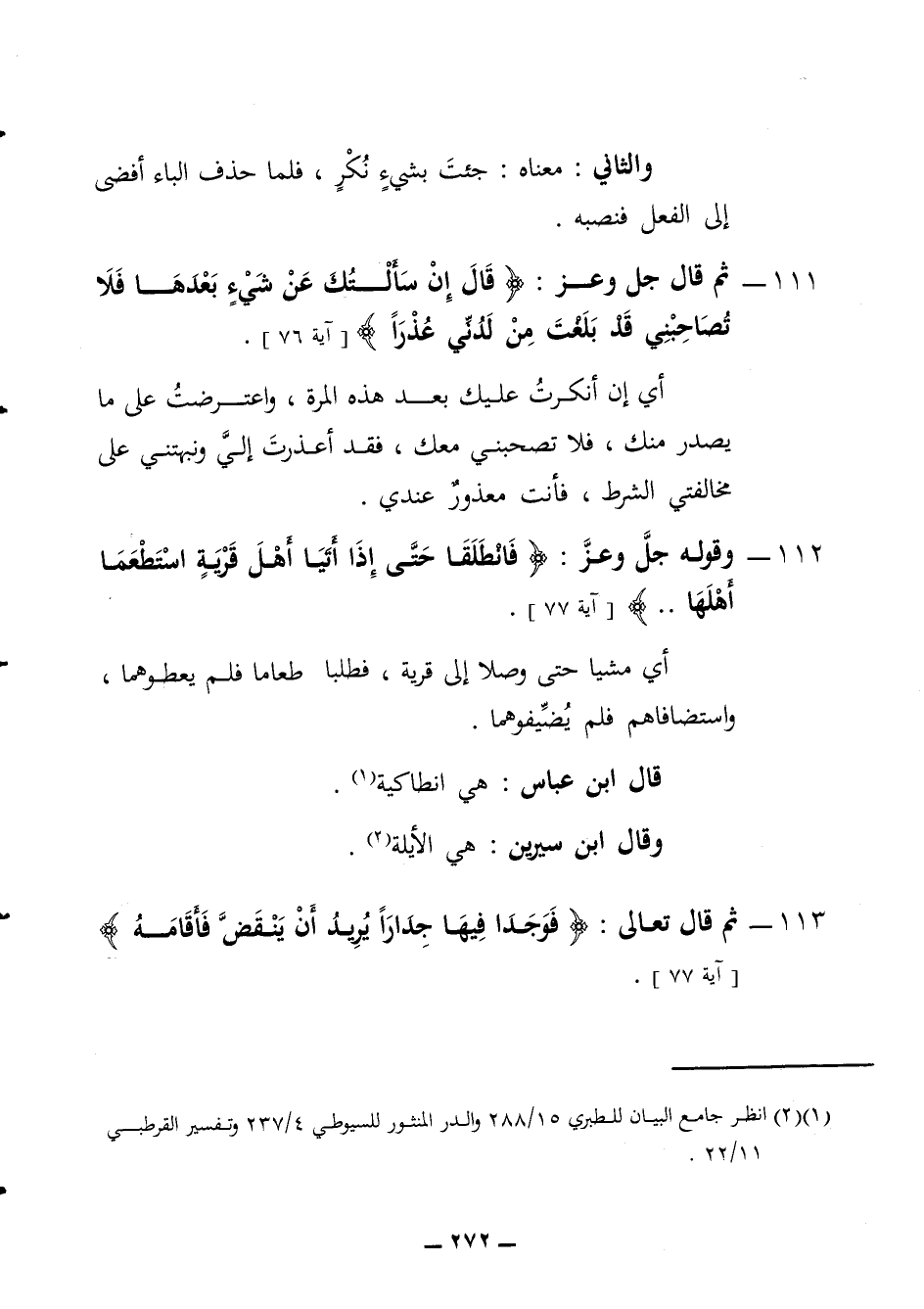 والثاني معناه جئت بشئ نكر فلما حذف الباء أفضى الى الفعل فنصبه 111 - ثم قال جل وعز قال إن سألتك عن شئ بعدها فلا تصاحبني قد بلغت من لدني عذرا أي إن انكرت عليك بعد هذه المرة واعترضت على ما يصدر منك فلا تصحبني معك فقد أعذرت الى ونبهتني يحيى على مخالفتي الشرط فأنت معذور عندي 112 - وقوله جل وعز فانطلقا حتى إذا أتيا أهل قرية استطعما أهلها أي مشيا حتى وصلا الى قرية فطلبا طعاما فلم يعطوهما واستضافاهم فلم يضيفوهما قال ابن عباس هي انطاكية وقال ابن سيرين هي الأيلة 113 - ثم قال تعالى فوجدا فيها جدارا يريد أن ينقض فأقامه